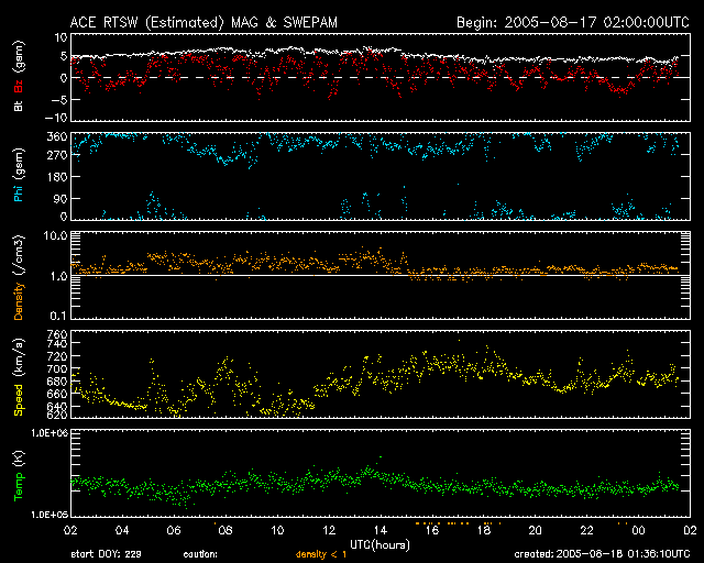 2005/ 8/18 10:37 更新 コロナホールによる高速の太陽風が続いています(680km/秒)。磁気圏は比較的穏やかです。 担当 篠原 コロナホールによる太陽風の高速状態が続いています。 650km/秒から700km/秒の間で変化しており、現在は680km/秒くらいです。 磁場強度(ACEの白線)は5nTで普通のレベルで安定しています。 磁場の南北成分(赤線)は細かく振動していますが、北向き(プラス)にかたよって変化しているため、 オーロラ活動につながる南向き成分(マイナス)は、小さな変化が見えている程度です。 このため、磁気圏の活動は低下していて、比較的穏やかな状態になっています。 オーロラの活動を示しているAE指数のグラフを見ると、 1日中連続的に変動してはいますが、300nT程度の小さな変化が現れているだけです。 高速太陽風は明日いっぱいくらいまで続くでしょう。 明日には低下に向かうと思われます。 SOHO EIT284の太陽写真を見ると、太陽の中心から下よりにコロナホールが見えています。 前の周期の変化を調べると、前回はこのコロナホールの影響は地球には届きませんでした。 下に寄りすぎているためと思われます。 今周期も同じ様になると思われますが、どうでしょうか。 放射線帯の高エネルギー電子の密度が、やや増加の傾向を見せています。 まだ警戒ラインよりも下にありますが、明日、明後日以降注意が必要になるかもしれません。 太陽面はとても穏やかです。 797黒点群は規模が縮小しているようですし、798黒点群もあるかないかくらいにしか見えていません。 X線の動画を見ても、フレア活動はほとんど見られませんでした。 SOHO衛星のEIT284カメラの映像 (c) SOHO (ESA & NASA)