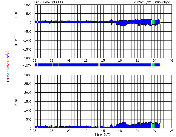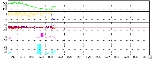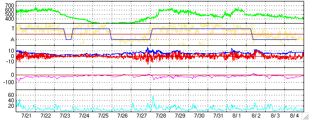 ACEが観測した太陽風の磁場(1番上の枠、白線は全体の強度、赤線は南北成分) および、太陽風の密度(3番目の橙線)、速度(4番目の黄線) (c) NOAA/SEC ![]() リアルタイムAE指数 下段のAEグラフの値が高くなると、オーロラ活動が活発化しています。 (c) 京都大学, NICT ![]() 27日の太陽周期に合わせたデータプロット (太陽風版) 太陽が同じ面を地球に向けていた27日前の変化から、今後を予想することができます。 (c) NICT