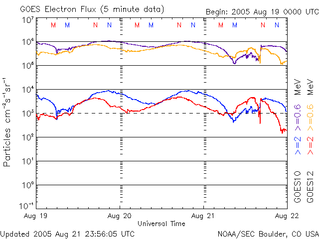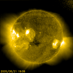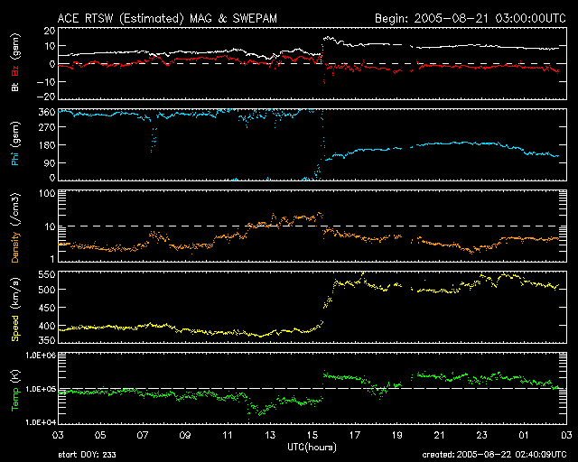 2005/ 8/22 11:43 更新 昨夜より太陽風の速度が上昇して乱れています。今朝、M2.8の中規模フレアが発生しました. 担当 篠原 太陽風に急な乱れが発生しました. ACE衛星の観測によると、22日0時(世界時21日15時)頃に、 太陽風の速度が400km/秒から520km/秒に急に上昇し、磁場強度も15nT近くに強まりました。 太陽風磁場の大まかな方向も「地球から太陽方向」から「太陽から地球方向」へと切り替わっています。 原因についてははっきりとは分かりません。 数日前のニュースで書いていた、南に寄って見えていたコロナホールの影響というのが考えられます。 しかし、それにしては速度の上がり方が急すぎる印象もあります。 乱れが発生した後、太陽風の磁場は弱い南向きを続けています。 このため、AE指数には小規模の300nT程度の変化が連続的に発生しています。 磁場強度は現在も10nT弱あり、急に大きく南を向くような変化が発生すると、 オーロラ活動も一気に活発化するでしょう。 この変化にともなって、放射線帯の高エネルギー電子は密度を下げています。 警戒ラインから一段下がっています。 太陽では、とうとう798黒点群がフレア活動を開始したようです。 今朝、22日10時(世界時22日1時)にM2.8の中規模フレアを発生させています。 798群は21日19時(世界時21日10時)にもC2.8の小規模フレアを起こしています。 現在も規模は大きく、注意が必要でしょう。 中規模フレアに伴って、CME(太陽ガスの放出現象)も起こっている可能性があります。 その場合、現在の黒点群の位置から考えて、地球へも影響が及びそうです。 SOHO衛星のEIT284カメラの映像 (c) SOHO (ESA & NASA)