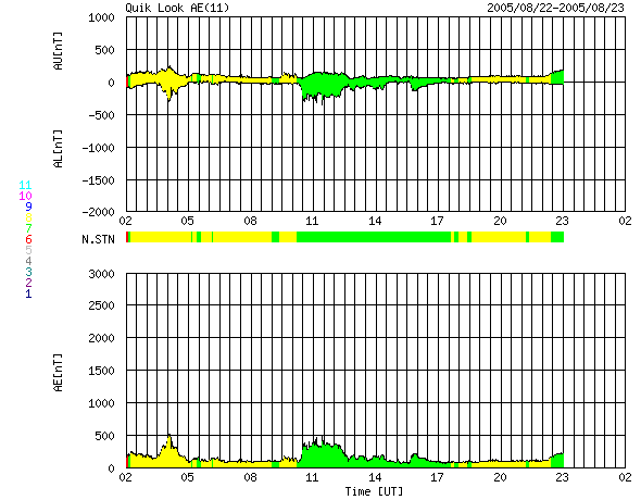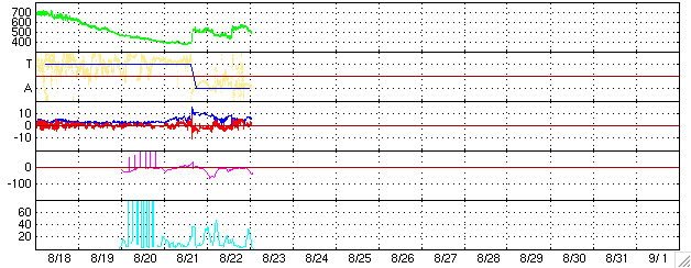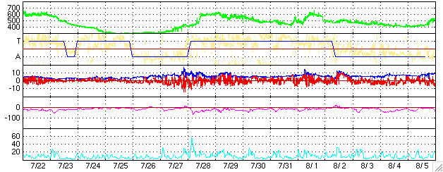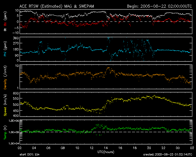 GOES衛星の太陽X線データ (c) NOAA/SEC ![]() SOHO衛星のMDIカメラによる太陽黒点 (c) SOHO (ESA & NASA) ![]() GOES衛星の太陽放射線データ (c) NOAA/SEC ![]() ACEが観測した太陽風の磁場(1番上の枠、白線は全体の強度、赤線は南北成分) および、太陽風の密度(3番目の橙線)、速度(4番目の黄線) (c) NOAA/SEC ![]() リアルタイムAE指数 下段のAEグラフの値が高くなると、オーロラ活動が活発化しています。 (c) 京都大学, NICT ![]() 27日の太陽周期に合わせたデータプロット (太陽風版) 太陽が同じ面を地球に向けていた27日前の変化から、今後を予想することができます。 (c) NICT