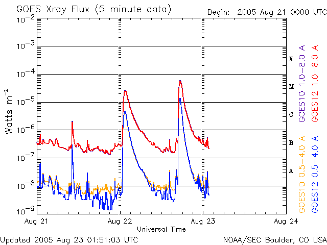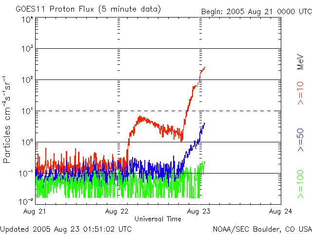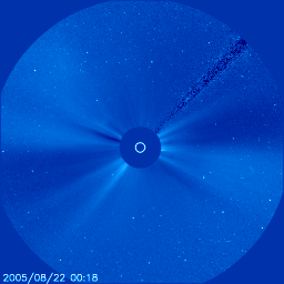 2005/ 8/23 10:53 更新 昨夜、M5.6の中規模フレアが発生しました。太陽放射線が増加しています。CMEのため、明日以降太陽風が乱れるでしょう。 担当 篠原 798黒点群が活発に活動しています。 昨日の朝、22日10時(世界時22日1時)のM2.6中規模フレアに続いて、 昨夜、23日2時(世界時22日17時)にM5.6の中規模フレアを起こしました. これらふたつのフレアによって、太陽放射線(非常に高速のプロトン粒子)が増加しています。 最初のフレアの発生後に10PFU近くに上がり、次のフレアでは一気に200PFUに上がっています。 警戒レベルを越えていますので、衛星運用では注意が必要でしょう。 太陽放射線は現在も増加傾向にあるようですので、今後の変化にも注意してください。 798黒点群は規模を保っています。 引き続き大きなフレア活動を起こす可能性があります。 ふたつの中規模フレアは、どちらも継続時間の長いタイプで、CME(太陽ガスの放出現象)を起こしています。 SOHO LASCO C3の動画をご覧下さい。 2回、白いガスが太陽から吹き出している様子が見えています。 見た印象では、1回目の方が地球向きにより強く吹き出していて、 2回目の方は右下方向に偏って飛び出しているようです。 分かりにくいですが、動画の最後の辺りで白い筋のようなノイズが画面全体にちらちら見えていますが、 これは増加した太陽放射線の影響です。 このような見え方の激しいものを、Snowstorm(吹雪)と呼んでいます。 このくらいだとstorm(嵐)というより、小雪がちらついているという感じでしょうか。 CMEで飛び出した高速の太陽ガスは、速度が速ければ2日、遅めだと3日程かけて地球へやってきます。 (特に速い場合は1日半くらい、ものすごく速いと1日で来てしまう事もあります) 今回のCMEは比較的速そうですので、 第一波が明日の午前中から午後にかけてやってくるのではないでしょうか。 半日ほど遅れて、第二波がやってきそうです。 太陽風の速度が急激に上昇し、磁場強度も一気に強まるなどの変化が予想されます。 オーロラが活発化したり、磁気嵐が発生する可能性があります。 太陽風磁場が大きく南を向いた場合は、特に磁気圏の活動が激しくなりますので注意してください。 擾乱が早く地球に来るほど、速度も高くより大きく乱れる要因となります。 到来が遅れれば、それだけ規模も小さくて済むはずです。 太陽風は現在500km/秒で高速の状態が続いています。 昨夜も500km/秒から550km/秒に速度が一旦上昇するという変化が現れていました。 全体的に、コロナホールの影響域に入っているということなのでしょうか。 SOHO EIT284の太陽写真を見ると、太陽の中心線よりやや下にあるコロナホールが、 太陽の右側半分の位置に来ており、こちらの影響が地球に及んでもよさそうな状態に入っています。 現在の高速風がこのままこちらのコロナホールの高速風に繋がってしまいそうです。 どのようになるのでしょうか。 しかし、これらの変化が見られる前に、CMEによる突然の高速風が地球を襲うことになるでしょう。 SOHO LASCO C3カメラが捉えた、7月22日、23日の2つの中規模フレアによるCME(太陽ガスの放出現象)。 (c) ESA & NASA ![]() SOHO衛星のEIT284カメラの映像 (c) SOHO (ESA & NASA)