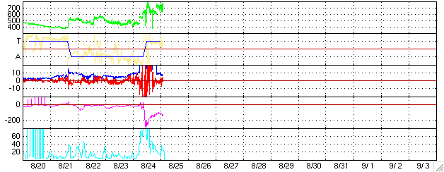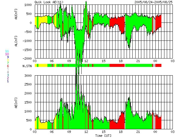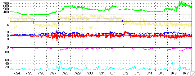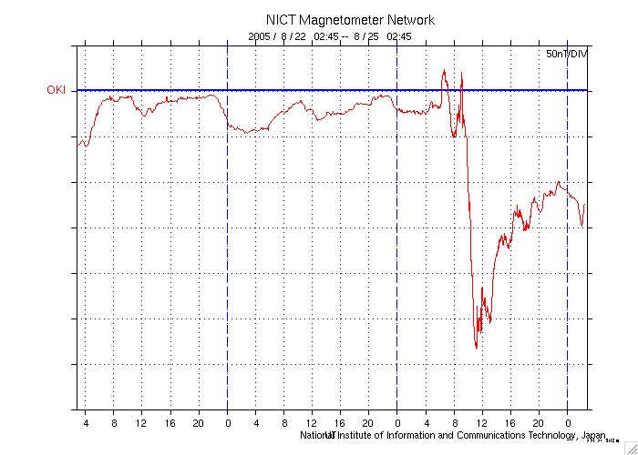 ACEが観測した太陽風の磁場(1番上の枠、白線は全体の強度、赤線は南北成分) および、太陽風の密度(3番目の橙線)、速度(4番目の黄線) (c) NOAA/SEC ![]() リアルタイムAE指数 下段のAEグラフの値が高くなると、オーロラ活動が活発化しています。 (c) 京都大学, NICT ![]() 沖縄の磁場擾乱 下へ下がるほど、擾乱が発達している事を意味します。 (c) NICT ![]() 27日の太陽周期に合わせたデータプロット (太陽風版) 太陽が同じ面を地球に向けていた27日前の変化から、今後を予想することができます。 (c) NICT