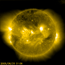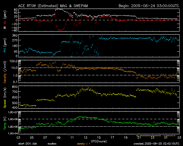 2005/ 8/25 11:43 更新 強い南向き磁場のため、大規模な磁気嵐が発生しました。太陽風は高速ですが磁場強度は下がり、磁気圏は落ち着きつつあります。 担当 篠原 昨夕、24日17時半(世界時24日8時半)より、太陽風磁場が非常に強まり(60nT)、 更に、-60nTに達する大変強い南向き磁場が現れました。 太陽風の速度も650km/秒と高速になり、磁気圏が一気に活動的になりました。 AE指数のグラフを見ると、24日19時(世界時24日10時)頃に3000nTのグラフいっぱいに たいへん激しい変動が記録されています。 この頃は、オーロラの活動領域が通常のオーロラ帯から低緯度側に大きく広がっていて、 もはや通常の指数測定ができない状態になっていたでしょう。 太陽風の非常に強い南向きは1時間半程度と短時間でしたが、強度が非常に強かったため、 激しい磁気嵐も発生しました。 沖縄の磁場データを見ると、静穏レベルの青線から-250nTを越える磁場の減少が観測されています。 この磁場強度の低下は、地球の周囲にリング状の電流系が発達する事で発生します。 従って、グラフが下がれば下がるほど、磁気嵐が発達していることを意味します。 京都大学のDst速報値でも、-250nT程度の磁場の変化が観測されています。 spaceweater.comでは、 アメリカ合衆国中部のコロラド州で撮影されたオーロラが掲載されていました。 オーロラが極域からかなり広い範囲に広がっていた事を示しています。 これに続いて、今後続々とオーロラの観測報告が掲載されるのではないでしょうか。 太陽風のデータを見ると、25日5時半(24日20時半)にも、新しい速度変化が観測されています。 これが2つめのCMEによる太陽風の乱れではないでしょうか。 速度が600km/秒から700km/秒に上昇しましたが、磁場強度は20nTから10nTに弱まっています。 現在、ACEの磁場データの縦軸がとても広くなってしまっていて、小さな変化が見にくくなっています。 弱いながらも磁場が南向きにもなっているようで、 AE指数によるとオーロラ活動は現在も500〜1000nTの規模で活発に続いているようです。 昨夜の60nTがあったため、現在の状況が小さく見えてしまいますが、 現在も太陽風は速度650km/秒と高速であり、磁場強度も10nT程度あります。 通常レベルの活発なオーロラ活動が続く条件は保っていますので、 引き続き太陽風の状態に注意してください。 23日23時(世界時23日14時)のM2.7中規模フレアによるCMEの影響が、 今夜から明日にかけて到来する可能性もあります。 ただし、太陽ガスは斜め方向に吹き出していますので、影響は小さくなると思います。 一連の騒動を起こした、798黒点群は太陽の西に没してしまいました。 一方、新しい黒点群が東の端に見えてきました。 どのような活動度の群なのでしょうか。 太陽放射線は次第に強度が下がり、現在は10PFUを切っています。 SOHO衛星のEIT284カメラの映像 (c) SOHO (ESA & NASA)
