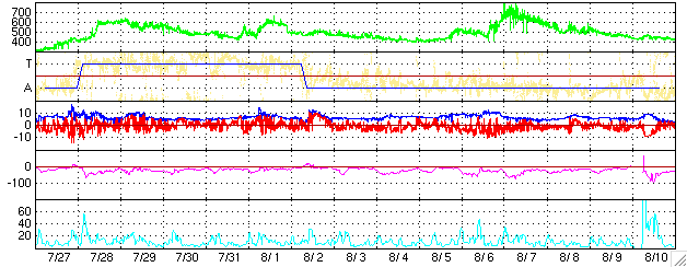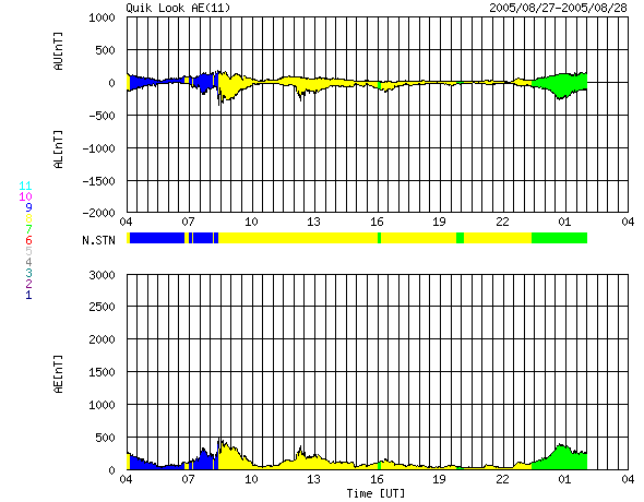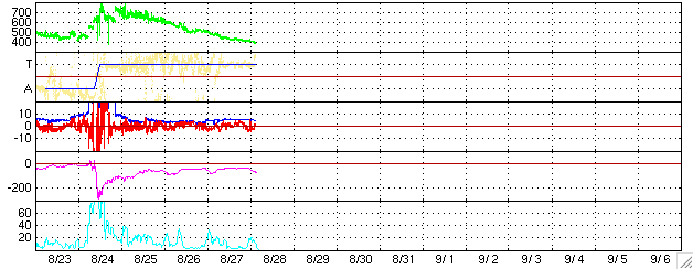 ACEが観測した太陽風の磁場(1番上の枠、白線は全体の強度、赤線は南北成分) および、太陽風の密度(3番目の橙線)、速度(4番目の黄線) (c) NOAA/SEC ![]() リアルタイムAE指数 下段のAEグラフの値が高くなると、オーロラ活動が活発化しています。 (c) 京都大学, NICT ![]() 27日の太陽周期に合わせたデータプロット (太陽風版) 太陽が同じ面を地球に向けていた27日前の変化から、今後を予想することができます。 (c) NICT