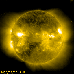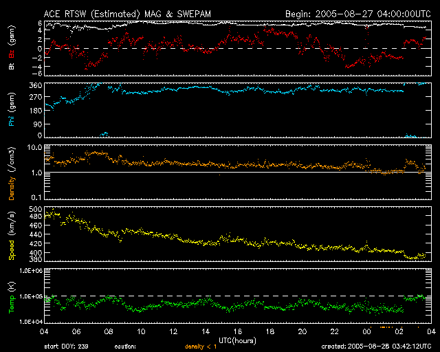 2005/ 8/28 12:43 更新 太陽風は通常の速度にもどりました。放射線帯の高エネルギー電子密度の高い状態が続いています。 担当 篠原 太陽風は速度が更に低下を続けて、通常レベルの400km/秒に戻りました。 磁場強度は5nTで、こちらも普通の状態です。 -4nT程度の南向きが続く時間帯が見られ、この時にオーロラがやや活動的になっています。 ただ、速度が下がっているために活動は小規模で、 AE指数で300nTの小さな変動が見られている程度です。 太陽風はこのまま比較的穏やかな状態をしばらく続けそうです。 SOHO EIT284の太陽写真では、中心からやや下の部分にコロナホールが見えています。 27日周期の図で前周期の変化を見ると、8月1日の突発的な変動と重なってしまっているのですが、 8月2〜3日にかけて速度が450〜500km/秒に上がる変化が見られています。 あるいは、この弱い高速風がコロナホールの影響によるものかもしれません。 明日以降変化が見られるかどうか、注目したい所です。 いずれにせよ、小規模な影響にとどまるでしょう。 放射線帯の高エネルギー電子は現在も高いレベルを保っています。 磁気圏の静穏状態が続くと、こちらはゆっくりとしか減少しません。 しばらく警戒状態が続きそうです。 太陽では、803黒点群がC1の小規模フレアを起こしています。 黒点が薄くなって見にくくなっていますが、磁場の複雑さを保っており、 中規模フレアなどを発生させる可能性があります。 SOHO衛星のEIT284カメラの映像 (c) SOHO (ESA & NASA)