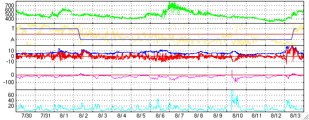 ACEが観測した太陽風の磁場(1番上の枠、白線は全体の強度、赤線は南北成分) および、太陽風の密度(3番目の橙線)、速度(4番目の黄線) (c) NOAA/SEC ![]() 27日の太陽周期に合わせたデータプロット (太陽風版) 太陽が同じ面を地球に向けていた27日前の変化から、今後を予想することができます。 (c) NICT