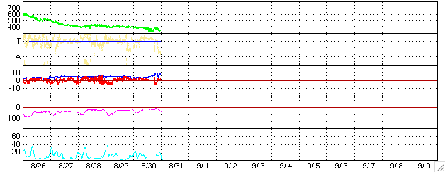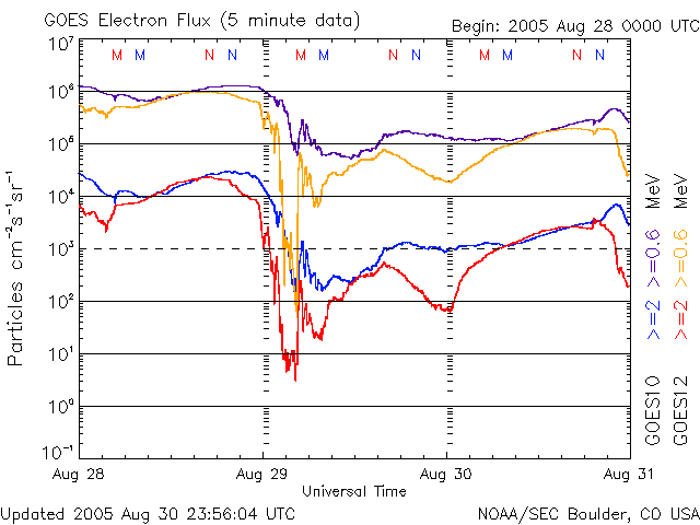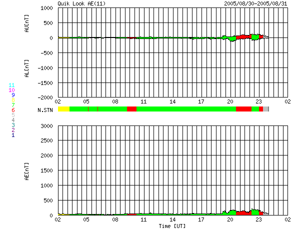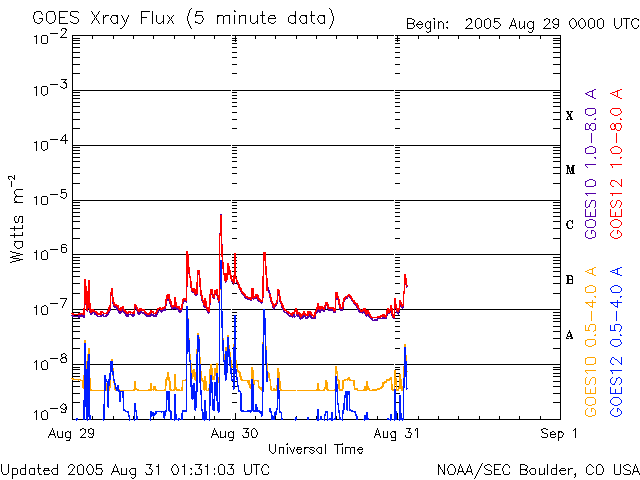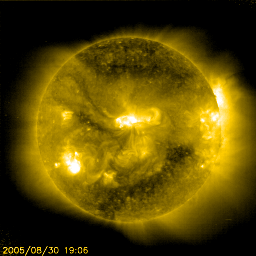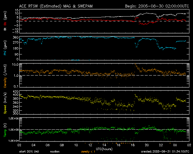 2005/ 8/31 10:35 更新 太陽風の磁場が強まっています。セクター境界が来るようです。 担当 篠原 太陽風の磁場強度が上昇しています。 昨日は5nTの普通の大きさだったのですが、31日3時(世界時30日18時)ころから変化が始まり、 次第に磁場強度が強まって、10nTに上がっています。 27日周期の図を参考にすると、そろそろセクター境界が来るのではないでしょうか。 太陽風の磁場の方向も、不安定になっています。 セクター境界とは、太陽風の磁場の大まかな方向が切り替わる現象で、 現在は「地球から太陽方向」になっているのが、これから「太陽から地球方向」に反転する見込みです。 この切り替わり自体は宇宙天気に対して大きな影響はないのですが、 境界を挟んで、太陽風の状態が変化する事があり、それによってオーロラ活動も変化することがあります。 太陽風の速度には目立った変化はなく、350〜400km/秒でやや遅めの状態が続いています。 しかし、この後、コロナホールの影響で、速度もいくらか上昇するかもしれません。 SOHO EIT284の太陽写真では、コロナホールが地球へ影響を及ぼし始める、目安の位置に達しています。 いまのところ、オーロラ活動は穏やかです。 磁場強度は強まっていますが、南向きがあまり現れていないということと、 速度も遅めであるということが重なっているからでしょう。 磁場強度が強まっているため、やがて大きな南寄りが現れるようなことになるかもしれません。 その場合は、オーロラ活動もある程度活発になるでしょう。 放射線帯の高エネルギー電子が、再び増加の傾向を示しています。 まだ警戒ラインには達していませんが、明日以降の変化に注意が必要でしょう。 太陽では、806黒点群が小さなCクラスフレアを起こしていますが、やや落ち着いた状態になっています。 SOHO衛星のEIT284カメラの映像 (c) SOHO (ESA & NASA)