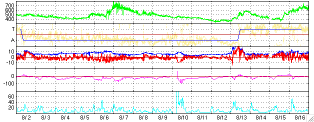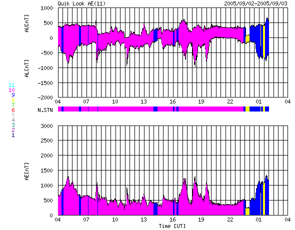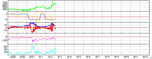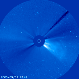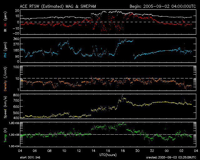 2005/ 9/ 3 12:28 更新 衝撃波がやってきました。太陽風の速度は650km/秒、オーロラ活動が活発になっています。 担当 篠原 2日22時半(世界時13時半)に太陽風の乱れがやってきました。 これは、31日に発生したCME(太陽ガスの放出現象)によるものです。 太陽風の速度が400km/秒から500km/秒に、比較的小幅ですが急な増加をしました。 磁場強度も5nTから10nTを越える強度に上昇しています。 今回の乱れは、衝撃波到来後も速度の上昇を続け、 4時間ほどかけて650km/秒まで上がって、その後は高速のまま安定しています。 衝撃波が来た2日22時半(世界時13時半)から3日3時(世界時2日18時)にかけて、 太陽風の磁場は-10nT前後の強い南向きが発生しています。 このため、この時間帯(地球では1時間ほど遅れますが)にオーロラ活動が活発になっています。 AE指数の図をご覧下さい。 その後、磁場は北を向きましたが、現在は南に回転して-5nTの南向きになっています。 速度が高いのでオーロラ活動が再び活発になっています(AE指数)。 高速の太陽風は今日1日程度続くのではないでしょうか。 南向きが続く間、オーロラも活発に続くでしょう。 太陽風の速度は、明日くらいには低下に向かうと思われます。 そして、更にもうひとつ新たなCMEが太陽で発生しています。 2日8時半(世界時1日23時半)のB4というとても小さなフレアに続いて、 SOHO LASCO C3カメラでCMEが観測されました。 今日の1枚目にこの動画を掲載しています。 ただし、この写真には、太陽の裏側で発生したCMEが重なって見えているとの指摘があります。 動画の中で、最初に左上寄りに飛び出しているガスが裏側のCMEで、 その次に下半分を中心に飛び出しているのが、こちら側のCMEではないかと思います。 このCMEの影響は、4日の昼から5日にかけてやってくるでしょう。 太陽のフレア活動は静穏でした。 黒点は小さく見えるだけで、寂しい太陽面になってきました。 SOHO LASCO C3カメラが捉えた、9月2日のCME(太陽ガスの放出現象)。 (c) ESA & NASA ![]() ACEが観測した太陽風の磁場(1番上の枠、白線は全体の強度、赤線は南北成分) および、太陽風の密度(3番目の橙線)、速度(4番目の黄線) (c) NOAA/SEC ![]() リアルタイムAE指数 下段のAEグラフの値が高くなると、オーロラ活動が活発化しています。 (c) 京都大学, NICT ![]() GOES衛星の太陽X線データ (c) NOAA/SEC ![]() SOHO衛星のMDIカメラによる太陽黒点 (c) SOHO (ESA & NASA) ![]() 27日の太陽周期に合わせたデータプロット (太陽風版) 太陽が同じ面を地球に向けていた27日前の変化から、今後を予想することができます。 (c) NICT