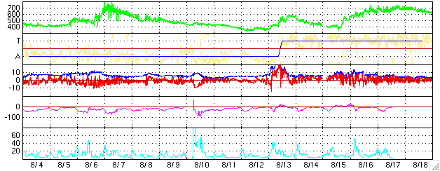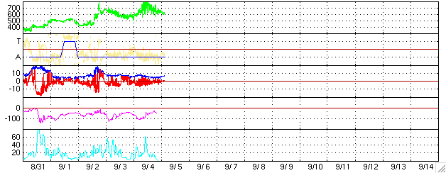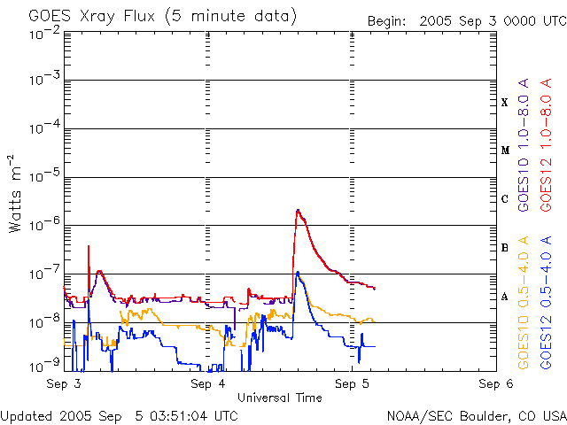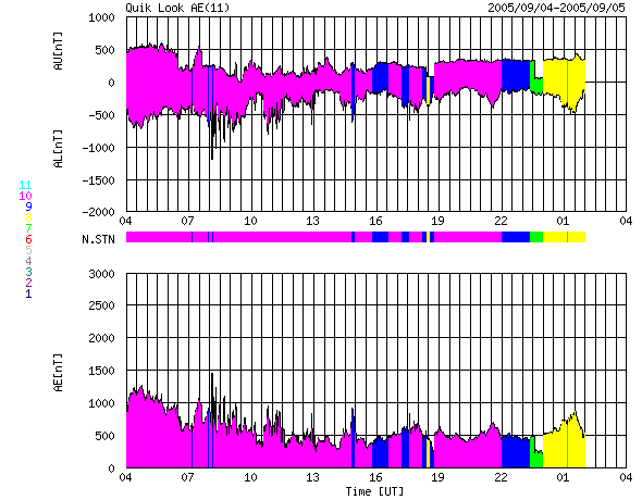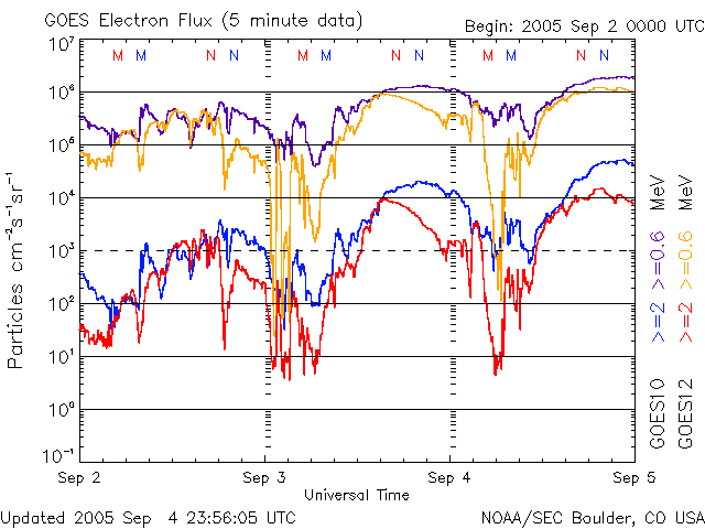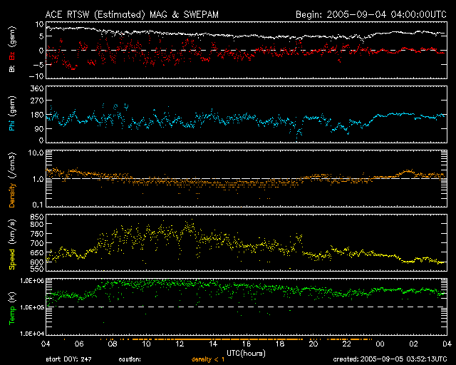 2005/ 9/ 5 12:55 更新 一時、太陽風の速度が750km/秒へ上がりました。現在は600km/秒に戻っています。放射線帯の高エネルギー電子が高いレベルを保っています。 担当 篠原 ACE衛星の観測によると、昨日の午後、4日16時(世界時4日7時)頃から太陽風が速度を上げ、 それまでも600km/秒と高速だったのですが、750km/秒と更に高速になりました。 高速風は4日21時(世界時4日12時)頃に最高となり、その後緩やかに低下して、 現在は再び600km/秒に戻っています。 この辺りの変化が、2日のB4フレアによるCMEと関連した変化だったのでしょうか。 この他には目立った太陽風の乱れは無く、よく分かりません。 太陽風は、これから次第に速度が低下して、穏やかになるでしょう。 太陽風磁場は今日の図で、前半部分で南向き-5nT前後の変化が続いています。 そのため、オーロラ活動もこの辺りの時間帯では活発に発生していました。 図の後半は南北成分は0付近に弱まっており、オーロラ活動も低下しているでしょう。 AE指数のグラフは、ここ数日、幅が広く出てしまっている様に感じます。 今日の図の後半も、本当はもっと小さな活動なのではないかと思います。 放射線帯の高エネルギー電子は、高いレベルが続いています。 衛星の運用などでは注意が必要です。 太陽面は805黒点群が寂しく見えているだけです。 X線のグラフを見ると、C2.0の小規模フレアが、4日23時(世界時4日14時)に観測されています。 これは、805群ではなく、西の端(右の端)やや上に、白っぽくもやもや見えている辺りで発生したものです。 今は見えなくなってしまった、803黒点群があった場所です。 フレア活動は、基本的にはこのまま穏やかな状態が続くでしょう。 ACEが観測した太陽風の磁場(1番上の枠、白線は全体の強度、赤線は南北成分) および、太陽風の密度(3番目の橙線)、速度(4番目の黄線) (c) NOAA/SEC ![]() リアルタイムAE指数 下段のAEグラフの値が高くなると、オーロラ活動が活発化しています。 (c) 京都大学, NICT ![]() GOES衛星による、静止衛星軌道における高エネルギー電子の変化 (c) NOAA/SEC ![]() SOHO衛星のMDIカメラによる太陽黒点 (c) SOHO (ESA & NASA) ![]() GOES衛星の太陽X線データ (c) NOAA/SEC ![]() 27日の太陽周期に合わせたデータプロット (太陽風版) 太陽が同じ面を地球に向けていた27日前の変化から、今後を予想することができます。 (c) NICT