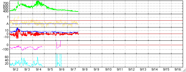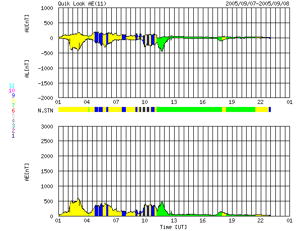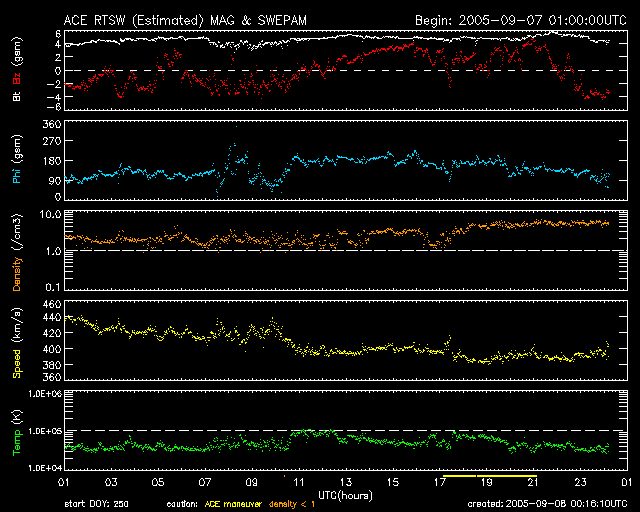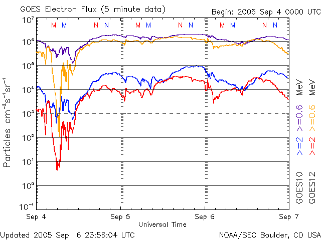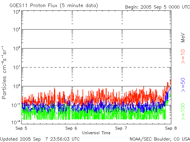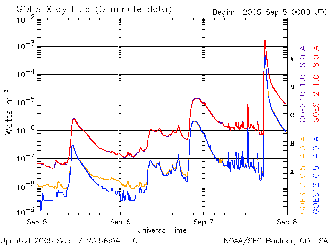 2005/ 9/ 8 09:19 更新 8日2時(世界時7日17時)に、X17の猛烈な太陽フレアが太陽の東端で発生しました。 担当 篠原 今日の未明、8日2時(世界時7日17時)に、X17の猛烈な太陽フレアが発生しました。 発生したのは、ここ数日活発な活動が見えていた、太陽の東端の領域です。 フレアの強さ(太陽のX線強度)がX1というレベルに達すると、大規模フレアと呼びますが、 X17とはX線強度がX1の17倍に達する、非常に大規模のフレアです。 このフレアは、30年間の観測史上第5位に入る様です。 太陽放射線(非常に高速のプロトン粒子)が増加を始めています。 今後大きく増加する可能性がありますので、衛星の運用などでは注意してください。 このフレアに伴って、CME(太陽ガスの放出現象)が発生していると思われます。 発生した場所が地球から真横を向いていますので、 吹き出したガスもまたほとんど真横に向かって飛び出しているでしょう。 ですので、地球では、太陽風が大きく変化することはないと思われます。 しかし、フレアの規模が非常に大きいだけに、ある程度の乱れは達するかもしれません。 どのようになるか興味が持たれます。 SOHO衛星の写真が見られるようになると、具体的に様子が分かると思います。 太陽風は速度が400km/秒、磁場強度も5nTで、どちらも通常のレベルです。 南向きの磁場が度々現れており、それに合わせて小規模のオーロラ活動が見られています。 今日1日はこのまま穏やかに推移するでしょう。 放射線帯の高エネルギー電子は密度を下げ始めています。 GOES10(青線)は警戒レベルに達していますが、GOES12(赤線)は切りつつあります。 GOES衛星の太陽X線データ (c) NOAA/SEC ![]() SOHO衛星のMDIカメラによる太陽黒点 (c) SOHO (ESA & NASA) ![]() GOES衛星の太陽放射線データ (c) NOAA/SEC ![]() ACEが観測した太陽風の磁場(1番上の枠、白線は全体の強度、赤線は南北成分) および、太陽風の密度(3番目の橙線)、速度(4番目の黄線) (c) NOAA/SEC ![]() リアルタイムAE指数 下段のAEグラフの値が高くなると、オーロラ活動が活発化しています。 (c) 京都大学, NICT ![]() GOES衛星による、静止衛星軌道における高エネルギー電子の変化 (c) NOAA/SEC ![]() 27日の太陽周期に合わせたデータプロット (太陽風版) 太陽が同じ面を地球に向けていた27日前の変化から、今後を予想することができます。 (c) NICT