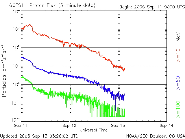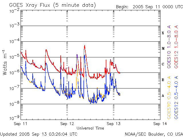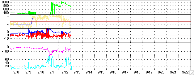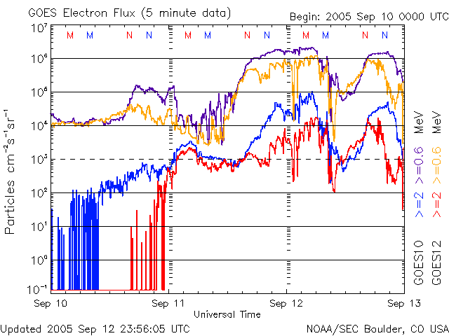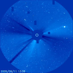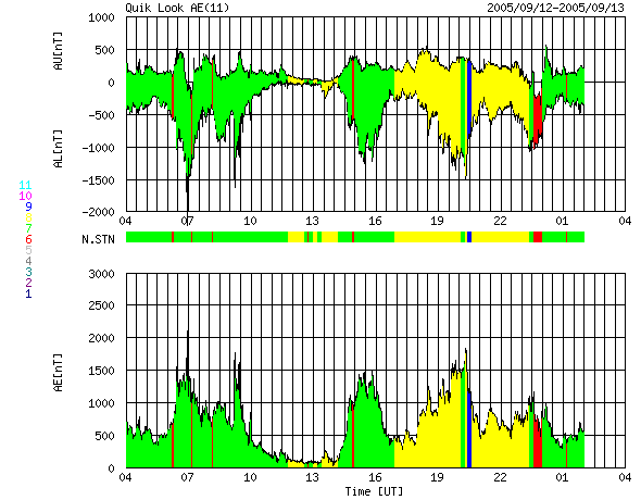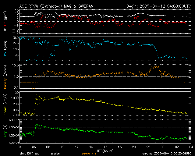 2005/ 9/13 12:29 更新 太陽風が乱れており、オーロラ活動がとても活発です。太陽風の擾乱は今後も続きそうです。 担当 篠原 太陽風は依然高速の状態が続いています。 そのため、活発な磁気圏の活動が続いています。 ACE衛星の観測データによると、12日15時(世界時12日6時)に再び速度の急上昇が発生しました。 太陽風の速度はそれまでの700km/秒から、1000km/秒と非常に高速な状態に戻っています。 これは、11日7時(世界時10日22時)に発生したX2.1大規模フレアにともなう CME(太陽ガスの放出現象)の影響だと思われます。 太陽風の磁場も10nTに強まり、南向き磁場は-5nT前後のものが度々現れています。 この影響で、オーロラも非常に活発になっています。 AE指数では、1500nTの非常に大きな変動が頻繁に観測されています。 極域の夜空はさぞ美しい光景になっていることでしょう。 太陽風の速度は、ゆっくりと低下していますが、依然750km/秒ととても高速です。 今後も、太陽風磁場の南寄り傾向が続けば、激しいオーロラ活動が続くでしょう。 オーロラの様子は、NICTのアラスカライブカメラで見る事ができます。 今は天気が悪いようですが、日本時間の午後から夜にかけてが、現地の観望好適時刻です。 太陽では、9月12日17時半(世界時12日8時半)にM6.1の中規模フレアが発生しています。 808黒点群は、登場時の勢いはなくなった様ですが、依然活発にフレアを起こしています。 11日21時半(世界時11日12時半)のM3.1中規模フレアによるCMEがSOHO衛星で観測されています。 この影響が、今日のうちに地球に来ると思われます。 その場合、引き続き太陽風の擾乱状態が保たれるでしょう。 太陽放射線(非常に高速のプロトン粒子)はレベルがすっかり下がっています。 現在、警戒ラインの10PFUを切るほどになりました。 太陽のフレア活動の低下に伴って、高速プロトンが作られなくなっているためでしょう。 太陽の活動が再び激しくならなければ、このまま更に低下して行くと思われます。 一方、磁気圏内の放射線帯高エネルギー電子は密度が高い状態が続いています。 GOES10、12の両衛星で、警戒ラインを越えた状態です。 こちらについては、引き続き注意が必要です。 アラスカライブカメラによる、9月12日(現地9月11日)のオーロラの様子。 (c) NICT/SALMON ![]() SOHO LASCO C3カメラが捉えた、11日21時半(世界時11日12時半)のM3.1中規模フレアに伴うCMEの様子。 (c) ESA & NASA ![]() ACEが観測した太陽風の磁場(1番上の枠、白線は全体の強度、赤線は南北成分) および、太陽風の密度(3番目の橙線)、速度(4番目の黄線) (c) NOAA/SEC ![]() リアルタイムAE指数 下段のAEグラフの値が高くなると、オーロラ活動が活発化しています。 (c) 京都大学, NICT ![]() GOES衛星の太陽X線データ (c) NOAA/SEC ![]() SOHO衛星のMDIカメラによる太陽黒点 (c) SOHO (ESA & NASA) ![]() GOES衛星の太陽放射線データ (c) NOAA/SEC ![]() GOES衛星による、静止衛星軌道における高エネルギー電子の変化 (c) NOAA/SEC ![]() 27日の太陽周期に合わせたデータプロット (太陽風版) 太陽が同じ面を地球に向けていた27日前の変化から、今後を予想することができます。 (c) NICT
