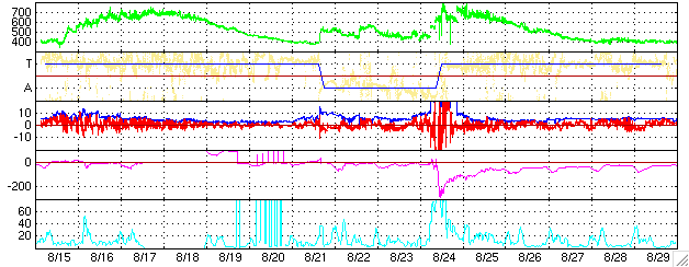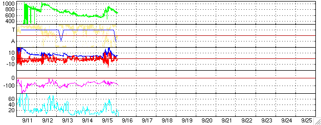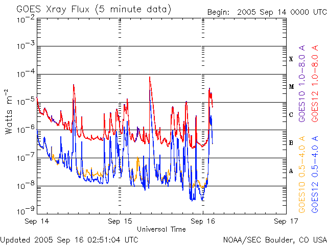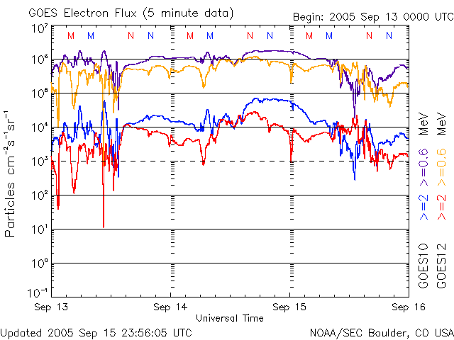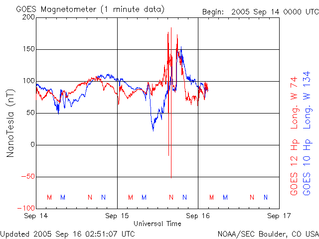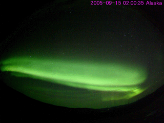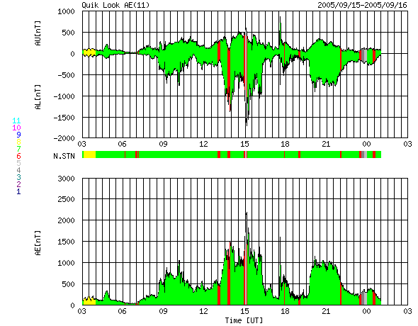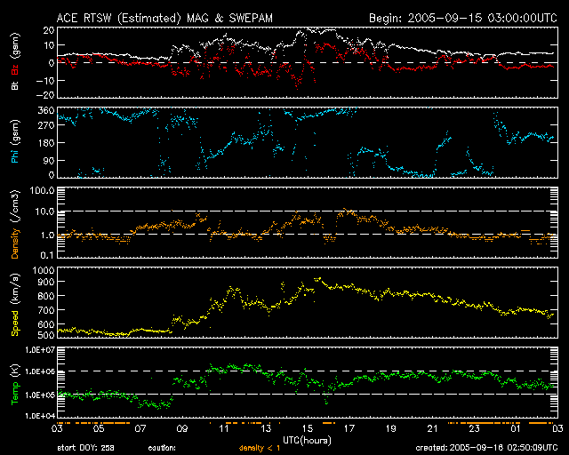 2005/ 9/16 11:54 更新 太陽風に大きな乱れが発生し、オーロラ活動が活発でした。808黒点群は依然活動的です。 担当 篠原 ACE衛星の観測によると、15日17時半(世界時15日8時半)頃から太陽風に大きな乱れが発生しました。 速度は、それまでも550km/秒と高速だったのですが、 次第に上昇して800〜900km/秒まで上がりました。 磁場強度も10〜20nT程度に大きく強まりました。 これは、14日5時(世界時13日20時)のX1.5大規模フレアの時に発生した、 CME(太陽ガスの放出現象)の影響と思われます。 磁気圏への影響を決定する、太陽風磁場の南向き成分(ACEの図の赤線マイナス成分)も、 -5〜-10nT程度に強まりました。 速度が高かった事もあり、磁気圏ではオーロラ活動がかなり活発化しました。 オーロラの活動度を示すAE指数のグラフを見ると、 1000〜1500nTの規模の激しいオーロラ活動が連続して観測されています。 特に、太陽風磁場の南向きが最も強まった、15日23時〜16日1時(世界時15日14〜16時)頃は、 オーロラ活動も特に激しくなっています。 この時、珍しい現象がアメリカの気象衛星GOESで観測されました。 今日の2枚目の図をご覧下さい。 これは、静止衛星で観測した磁場の北向き成分の変化です。3日分を示しています。 図のまんなか付近の赤線(GOES 12衛星)に注目してください。 2回ほど、細く針の様に下へ振れている部分があります。 これらは、0の線を越えて-20nT、-50nTまで達しています。 これは、太陽風が高速で磁場が大きく南を向いたために、地球の磁気圏がどんどんはぎ取られてしまい、 静止衛星が地球の縄張りである磁気圏から、 外側の太陽風の領域に飛び出てしまったことを示しています。 普段、磁気圏と太陽風の境目は地球の半径の10倍程度のところにあります。 しかし、今回、太陽風の乱れが大きかったため、磁気圏がどんどんはぎ取られて、 地球半径の6.6倍のところにある静止衛星の内側まで小さくなってしまったのです。 この現象は、太陽風の乱れがある程度大きくなると発生し、 ちょうどその時にGOES衛星が昼間側にあると観測されます。 昨日のアラスカは夕暮れとともに好天になり、一晩中オーロラを見ることができたようです。 オーロラツアーで出かけていたら、とうとう寝る事ができなかったでしょう。 その中でも最もきれいだった時間の約1時間分を、ライブカメラの画像から動画にして掲載します。 ファイルサイズがかなり大きくなってしまった(3.5MB)ため、回線が細い方にはご迷惑をおかけします。 動画の途中からは高いところで赤いオーロラが光り、オーロラがカーテンの様に見えています。 さて、太陽風は乱れのピークを越え、現在は速度が700km/秒とまだ高速ですが下がりつつあります。 磁場の強度も5nT弱へ下がっています。 磁気圏の乱れは、次第に収束に向かうでしょう。 太陽では、808黒点群が依然活発で、 昨日も15日17時半(世界時15日8時半)にX1.1の大規模フレアを起こしています。 そのほかにも、MからCの中小規模フレアを数多く起こしています。 今朝、16日10時半(世界時16日1時半)にも、M4.5の中規模フレアが起きています。 808黒点群は現在も規模が大きく、今後もフレア活動に注意が必要です。 太陽放射線(非常に高速のプロトン粒子)は強度が低下しています。 警戒ラインの10PFUを切っています。 放射線帯の高エネルギー電子は、昨日のオーロラ活動の影響で強度を下げています。 警戒ラインである10の4乗の線は切っています。 ただし、今後、高速太陽風の影響で再上昇する可能性がありますので、注意してください。 アラスカライブカメラによる、日本時間9月15日19時(現地9月15日2時)のオーロラの様子。 (c) NICT/SALMON ![]() GOES衛星が観測した磁場の北向き成分。赤線が針の様にマイナスに振れている箇所があるが、これは衛星が磁気圏の外側に出てしまったことを示している。 (c) NOAA/SEC ![]() ACEが観測した太陽風の磁場(1番上の枠、白線は全体の強度、赤線は南北成分) および、太陽風の密度(3番目の橙線)、速度(4番目の黄線) (c) NOAA/SEC ![]() リアルタイムAE指数 下段のAEグラフの値が高くなると、オーロラ活動が活発化しています。 (c) 京都大学, NICT ![]() SOHO衛星のMDIカメラによる太陽黒点 (c) SOHO (ESA & NASA) ![]() GOES衛星の太陽X線データ (c) NOAA/SEC ![]() GOES衛星の太陽放射線データ (c) NOAA/SEC ![]() GOES衛星による、静止衛星軌道における高エネルギー電子の変化 (c) NOAA/SEC ![]() 27日の太陽周期に合わせたデータプロット (太陽風版) 太陽が同じ面を地球に向けていた27日前の変化から、今後を予想することができます。 (c) NICT