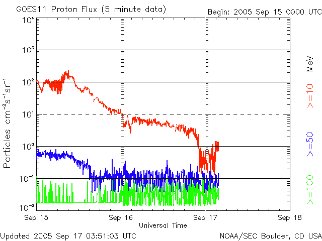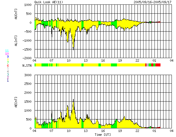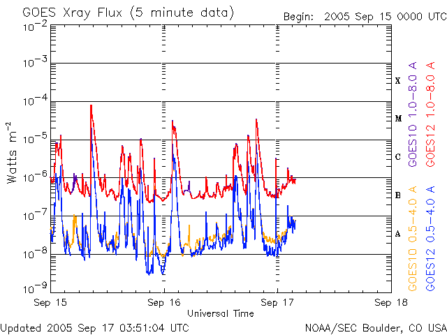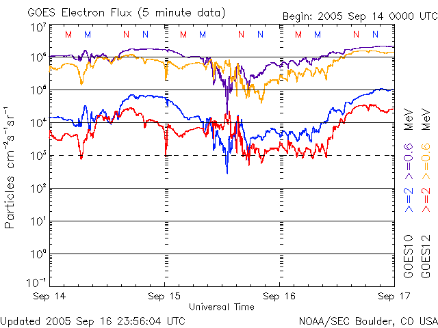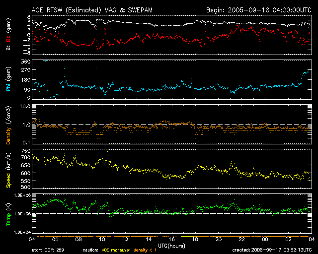 2005/ 9/17 12:55 更新 太陽風の速度は低下を続け(580km/秒)、磁気圏活動も次第に落ち着いてきました。放射線帯高エネルギー電子が強まっています。 担当 篠原 太陽風は速度をゆっくりと低下させ続けています。 昨日のニュース発行時点では700km/秒とかなり高速だったのですが、 その後は次第に下がって、現在は580km/秒とまだ高速ですがだいぶ落ち着いてきています。 この後も、一層速度は低下して、穏やかな太陽風になりそうです。 一方、太陽風の磁場は南寄りの傾向が続いています。 最大で-5nT程度の、それほど大きくない南向きが比較的継続して起こっています。 太陽風の速度が高速ですので、この影響でオーロラも連続的に見られています。 オーロラの活動度を表すAE指数のグラフを見ると、 1500nTに達する激しいオーロラ活動が起こった時間帯(前半)や、 500nT前後の小規模な活動が起こった時間帯(中間)などが見られます。 速度が速く、南向き磁場が大きかった(-5nT)ところでは、大きなオーロラ活動(前半)が、 南向きの磁場が小さくなると、小さなオーロラ(中間)がそれぞれ発生しています。 一時的に北向きになったところでは、オーロラ活動もほとんど無くなっています(後半)。 ACEのデータの最新部分では、再び南向きが見られています。 速度が下がってきているので規模は段々小さくなりますが、再びオーロラ活動が発生しそうです。 808黒点群は次第に規模が縮小しています。 黒点写真を見ても、最盛期に比べると黒点の大きさが半減したように見えます。 フレア活動もかつてのものすごい勢いは無くなっています。 それでも、黒点群としての規模は十分大きく、フレアもMクラスの中規模フレアを数回発生させています。 16日11時(世界時16日2時)にM2.2、 17日2時(世界時16日17時)にM1.4、 17日4時(世界時16日19時)にM3.6などです。 今後も、中規模、あるいは大規模のフレアを起こす可能性があります。 太陽放射線はすっかり下がって、1PFUを切りました。 放射線帯の高エネルギー電子は、急激に強まっています。 GOES 10では、10の5乗に達しています。 警戒レベルと言われるのは10の4乗のラインです。 その10倍に達しています。 ACEが観測した太陽風の磁場(1番上の枠、白線は全体の強度、赤線は南北成分) および、太陽風の密度(3番目の橙線)、速度(4番目の黄線) (c) NOAA/SEC ![]() リアルタイムAE指数 下段のAEグラフの値が高くなると、オーロラ活動が活発化しています。 (c) 京都大学, NICT ![]() SOHO衛星のMDIカメラによる太陽黒点 (c) SOHO (ESA & NASA) ![]() GOES衛星の太陽X線データ (c) NOAA/SEC ![]() GOES衛星の太陽放射線データ (c) NOAA/SEC ![]() GOES衛星による、静止衛星軌道における高エネルギー電子の変化 (c) NOAA/SEC ![]() | |||||||||||||||||||||||||||||||||||||||