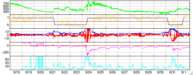 SOHO衛星のMDIカメラによる太陽黒点 (c) SOHO (ESA & NASA) ![]() GOES衛星の太陽X線データ (c) NOAA/SEC ![]() ACEが観測した太陽風の磁場(1番上の枠、白線は全体の強度、赤線は南北成分) および、太陽風の密度(3番目の橙線)、速度(4番目の黄線) (c) NOAA/SEC ![]() リアルタイムAE指数 下段のAEグラフの値が高くなると、オーロラ活動が活発化しています。 (c) 京都大学, NICT ![]() 27日の太陽周期に合わせたデータプロット (太陽風版) 太陽が同じ面を地球に向けていた27日前の変化から、今後を予想することができます。 (c) NICT