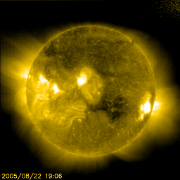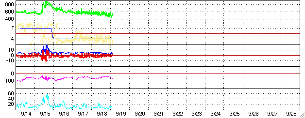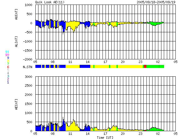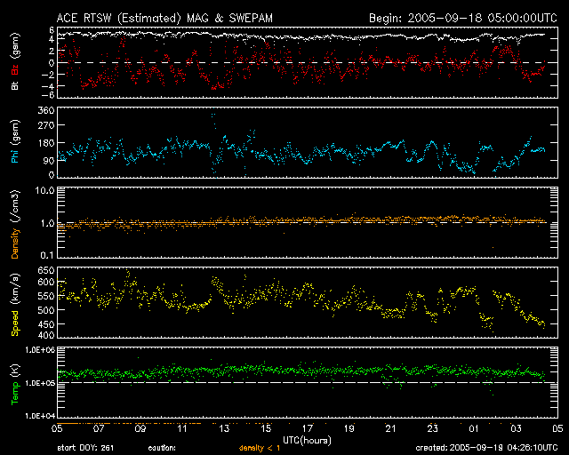 2005/ 9/19 13:29 更新 太陽のフレア活動は穏やかになりました。太陽風はやや高速で、小規模のオーロラ活動が見えています。 担当 篠原 808黒点群は規模もかなり小さくなり、西の端に近づいています。 大きなフレアも起こさなくなっています。 昨日の18日13時(世界時18日4時)にC3.8の小規模フレアを、 先ほど19日12時半(世界時19日3時半)にC3.8の小規模フレアを起こした程度です。 一方、東の端(左端)から新しく810黒点群が上ってきました。 太陽風は速度500km/秒前後で、やや高速の状態です。 太陽風磁場は強度5nT。南北に振動するような変化が見えています(赤線)。 オーロラ活動は小規模の変化が見られています。 AE指数の図では、前半部分に500nT程度の活動が続いています。 ここは、ACEの図で、太陽風磁場が南寄りに振動していたところと一致しています。 今後の太陽風の変化ですが、SOHO EIT284カメラの観測が停止しているため、 コロナホールなどの状況が分かりません。 前周期の太陽写真を参考にすると、この時期に小規模のコロナホールが太陽の南側にあった事が分かります。 この影響が明日あたりに見られるかもしれません。 27日周期の前周期(8月24日頃)に見られる高速風は、CMEによる周期性のない変化ですので、参考にはなりません。 そのもうひとつ前の周期(7月28日頃)には、速度が600km/秒くらいまで上昇しています。 放射線帯の高エネルギー電子密度は非常に高い状態が続いています。 今日も10の5乗の線を越えるレベルで推移しています。 減少はゆっくりになりますので、衛星運用では引き続き注意が必要です。 SOHO衛星のEIT284カメラの映像 (c) SOHO (ESA & NASA)