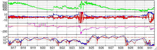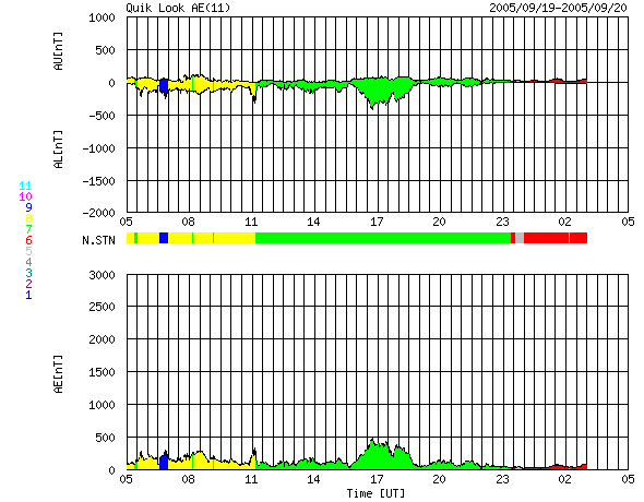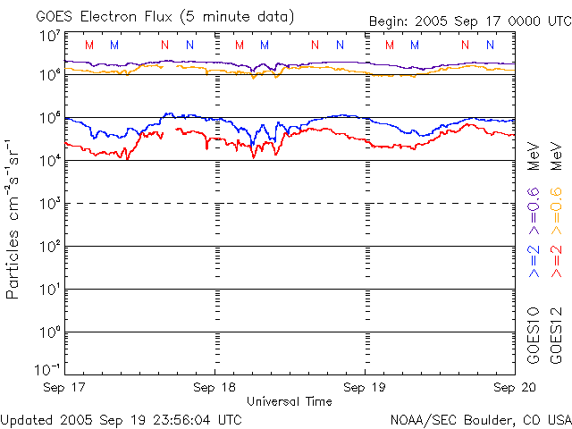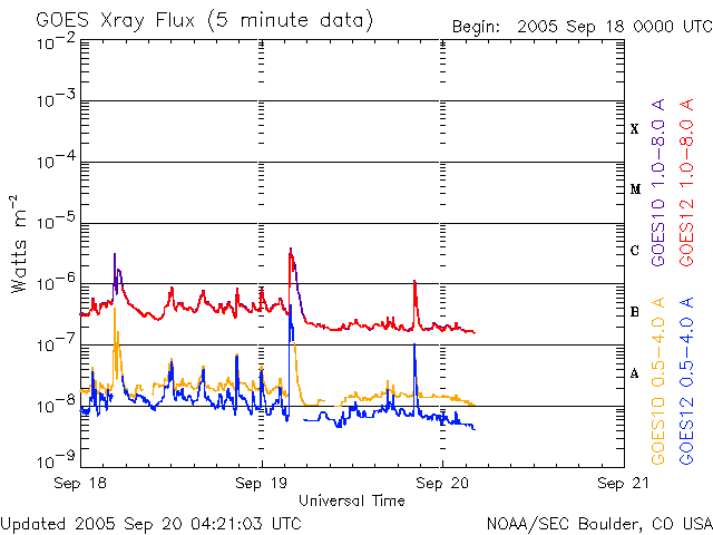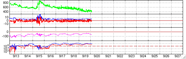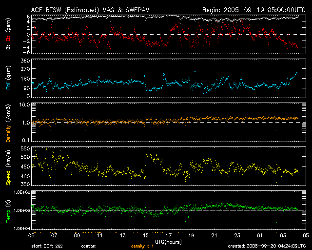 2005/ 9/20 13:28 更新 太陽風は通常の速度にほぼ戻りました。太陽のフレア活動も穏やかになっています。 担当 篠原 太陽風の速度は緩やかに下がっています。 昨日は500km/秒前後でしたが、現在は400km/秒近くまで下がっています。 ほぼ静穏レベルに戻ったと言えるでしょう。 太陽風の磁場強度も5nTで普通のレベルです。 磁場の南北成分(赤線)を見ると、南北に細かく振動する変化が見えます。 速度が下がった事もあり、オーロラ活動は低調になっています。 太陽風磁場の南向きが強まった時間帯に、 500nT程度の小規模なオーロラ活動が見られている程度です。 昨日記しましたが、これからコロナホールの影響で太陽風の速度に変化が見られるかもしれません。 SOHO EIT284の太陽写真が無いため、コロナホールの現況が分かりません。 そのため、過去の周期的変化からの予想です。 前回見えていたコロナホールは小規模でしたので、 現在は弱まってしまって、目立った影響は現れない可能性もあります。 太陽の黒点写真は昨日と同じ写真です。 808群は更に西に傾き、810群がもう少し中心に近づいているでしょう。 また、太陽の中心付近に小さな811黒点群が現れているとの情報があります。 太陽活動は、C1クラスの小さな小規模フレアが観測された程度で、 すっかり穏やかになりました。 放射線帯の高エネルギー電子は10の5乗のレベルを保っています。 今日の最後に27日周期の図を掲載していますが、1週間にわたって高いレベルが続いているのが分かります。 少しずつ減衰しているようですが、そのペースはゆっくりで、 今後も数日にわたって警戒状態が続くと思われます。 ACEが観測した太陽風の磁場(1番上の枠、白線は全体の強度、赤線は南北成分) および、太陽風の密度(3番目の橙線)、速度(4番目の黄線) (c) NOAA/SEC ![]() リアルタイムAE指数 下段のAEグラフの値が高くなると、オーロラ活動が活発化しています。 (c) 京都大学, NICT ![]() SOHO衛星のMDIカメラによる太陽黒点 (c) SOHO (ESA & NASA) ![]() GOES衛星の太陽X線データ (c) NOAA/SEC ![]() GOES衛星による、静止衛星軌道における高エネルギー電子の変化 (c) NOAA/SEC ![]() 27日の太陽周期に合わせたデータプロット (放射線帯電子版) 太陽が同じ面を地球に向けていた27日前の変化から、今後を予想することができます。 (c) NICT
