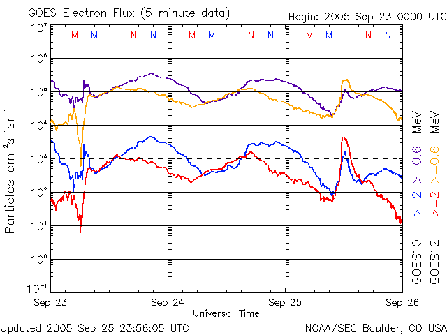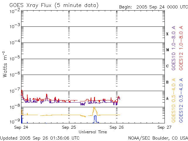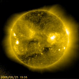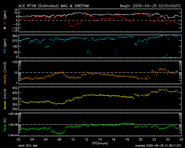 2005/ 9/26 10:39 更新 宇宙天気は穏やかな状態が続いています。太陽風の速度が400km/秒にやや上がりました。 担当 篠原 ACE衛星の観測によると、太陽風の速度がやや上昇して、400km/秒に上がっています。 かなり遅かったものが普通の速度に戻った、と言えます。 また、磁場強度も5nTから8nTにやや強まるなど(最新の部分では5nTに下がっています)、 小規模の変化が太陽風に発生しています。 地球の磁気圏へは、ACEの図の真ん中付近に見える、-8nTの強めの南向き磁場の影響が見られた程度です その時間帯に、AE指数では500nTの小規模の変化が見えています。 オーロラ活動は概ね静穏です。 一方、放射線帯の高エネルギー電子のグラフを見ると、太陽風磁場が大きく南を向いた時間帯に、 急に密度が増加する変化が見られています。 太陽風の影響で、磁気圏の中が急に動かされたということでしょうか。 現在は下がっていて、静穏レベルです。 SOHO EIT284の太陽写真を見ると、南半球(下側)に細長くコロナホールが見えていて、 その北側の先端(上端)が地球に影響を及ぼす位置に来つつあります。 明日以降、太陽風にいくらかの乱れが発生するかもしれません。 ただし、全体的に南側に寄りすぎていますので、地球へ大きな影響を及ぼすことはなさそうです。 太陽のフレア活動はとても静かです。 黒点群は810、812の2群で、昨日と変わっていません。 このまま穏やかな状態が続くでしょう。 SOHO衛星のEIT284カメラの映像 (c) SOHO (ESA & NASA)