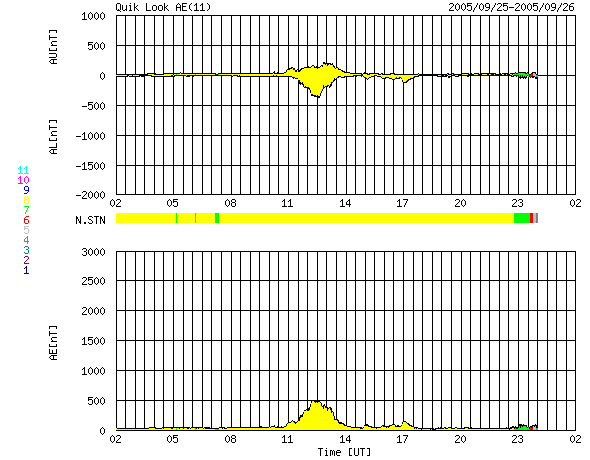 ACEが観測した太陽風の磁場(1番上の枠、白線は全体の強度、赤線は南北成分) および、太陽風の密度(3番目の橙線)、速度(4番目の黄線) (c) NOAA/SEC ![]() リアルタイムAE指数 下段のAEグラフの値が高くなると、オーロラ活動が活発化しています。 (c) 京都大学, NICT ![]() GOES衛星による、静止衛星軌道における高エネルギー電子の変化 (c) NOAA/SEC ![]() GOES衛星の太陽X線データ (c) NOAA/SEC ![]() SOHO衛星のMDIカメラによる太陽黒点 (c) SOHO (ESA & NASA) ![]() | ||||||||||||||||||||||||||||||||||||||||