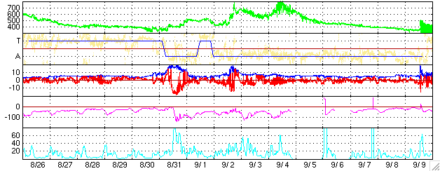 リアルタイムAE指数 下段のAEグラフの値が高くなると、オーロラ活動が活発化しています。 (c) 京都大学, NICT ![]() ACEが観測した太陽風の磁場(1番上の枠、白線は全体の強度、赤線は南北成分) および、太陽風の密度(3番目の橙線)、速度(4番目の黄線) (c) NOAA/SEC ![]() 27日の太陽周期に合わせたデータプロット (太陽風版) 太陽が同じ面を地球に向けていた27日前の変化から、今後を予想することができます。 (c) NICT