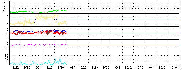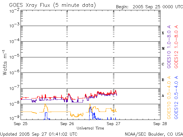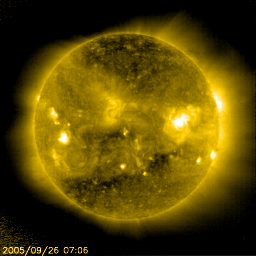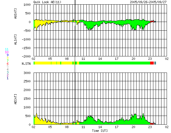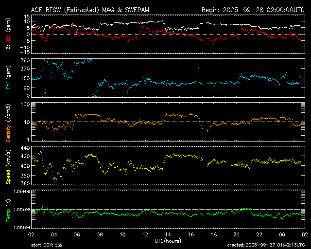 2005/ 9/27 10:42 更新 太陽風磁場南向きの影響で、オーロラがやや活発になりました。太陽風速度は400km/秒と通常の状態です。 担当 篠原 北極域のオーロラの活動度を示しているAE指数によると、 昨夜はオーロラがやや活発に発生していたようです。 500nT前後の小規模の変化が数回にわたって観測されています。 太陽風のデータを見ると、オーロラが活動していた時間帯に、 太陽風磁場が-5nT程度の南向きになっていたことが分かります。 この影響でオーロラ活動が刺激されたのでしょう。 太陽風の速度が400km/秒と通常のレベルだったこと、 -5nTという磁場強度も特に強い値ではないので、比較的小規模のオーロラ活動が発生したのでしょう。 太陽風磁場のセクター境界が来ています。 27日周期の図を参照すると、今回の切り替わりは前周期より1日早まった程度で、 ほぼ同じ位置で起こったと言えます。 また、太陽風の状況には目立った変化は発生していません。 太陽の南側に見える細長いコロナホールの影響が、これから太陽風に見られるかもしれません。 コロナホールが南側に寄っているので、あまり大きな影響はないのではないかと思いますが、 位置的には、そろそろ地球へ高速風が届く頃です。 太陽は静穏な状態が続いています。 GOES衛星のX線グラフには、目立ったフレア活動は観測されていません。 見えている黒点群は昨日同様、810、812の2つの黒点群です。 規模もほとんど変化ありません。 今後も穏やかな状態が続きそうです。 SOHO衛星のEIT284カメラの映像 (c) SOHO (ESA & NASA)