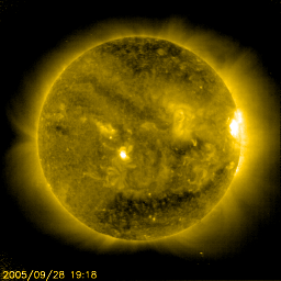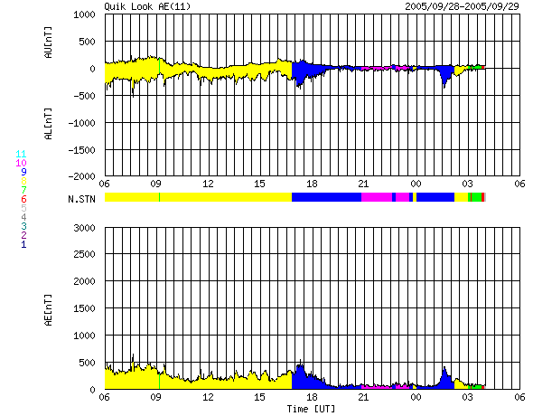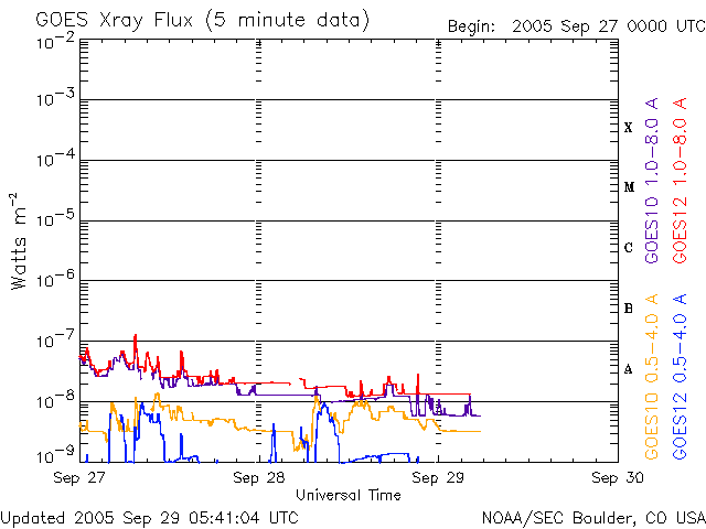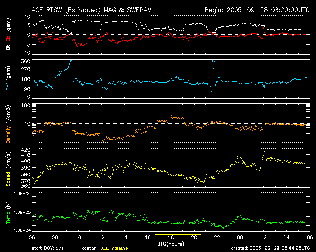 2005/ 9/29 14:48 更新 太陽、太陽風と穏やかです。小規模なオーロラ活動は見られますが、磁気圏も穏やかです。 担当 篠原 太陽風は、速度が370〜400km/秒の間でゆっくりと変化しています。 通常の速度レベルで、穏やかな状態です。 太陽風の磁場も強度が5nT前後で普通の状態です。 このACEの図の前半部分で、-3nT程度の弱い南向きが比較的長い時間続いています。 オーロラの活動度を示しているAE指数のグラフを見ると、 この太陽風磁場南向きに対応して、 図の前半部分で300nT程度の弱い活動が連続的に観測されています。 太陽風が穏やかな状態ですので、オーロラ活動も小さなものにとどまっています。 ACEの図では、後半は太陽風磁場の南向きは非常に小さくなっており、 オーロラ活動もほとんど見られなくなっています。 太陽風はこのまま穏やかな状態が続きそうです。 地球の磁気圏もこのまま穏やかに推移するでしょう。 太陽黒点では、810黒点群が西に没しつつあります。 太陽のほぼ中心に812群がありますが、黒点はとても小さく、 目を凝らさないと写真でも気づかないくらいです。 フレア活動は非常に静穏で、GOES衛星のX線グラフには何の変化も見られません。 昨日より学会参加のため京都に来ています。 土曜日にかけて更新が不定期になります。ご了承ください。 SOHO衛星のEIT284カメラの映像 (c) SOHO (ESA & NASA)
