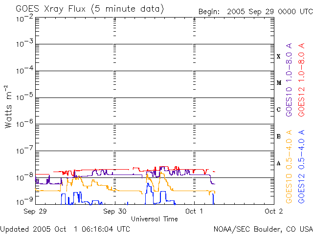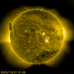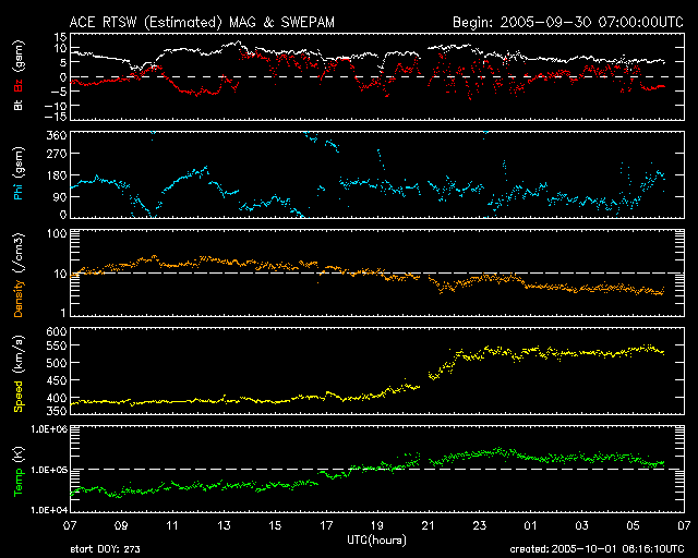 2005/10/ 1 15:20 更新 太陽風の速度が550km/秒に上昇しています。太陽は静穏です。 担当 篠原 太陽風の速度が急に上昇しています。 10月1日4時(世界時9月30日19時)ころから上昇を始め、 4時間ほどかけて550km/秒に上がりました。 変化の様子からコロナホールと関係していそうですが、 SOHOの写真では、目立ったコロナホールは見えていませんでした。 3日ほど前の写真に見えていた、とても小さいコロナホールの影響が来ているのでしょうか。 速度の上昇に先立って、太陽風の磁場が10nTくらいに強まりました。 南向きが現れていて、オーロラ活動を、ポン、ポンと数回起こしています。 まだ速度が遅かったので、それほど大きな活動にはつながっていません。 現在は太陽風の磁場強度は5nTに戻っています。 数nT程度の南向き磁場が時々現れている様ですので、 速度が上がっている事と重なって、オーロラ活動がやや活発になるかもしれません。 ただ、太陽の様子から考えて、高速の太陽風はそれほど長い時間続かないのではないでしょうか。 太陽のフレア活動は現在もとても静穏です。 812黒点群は姿を消したようです。 写真を見ると、812群の番号のすぐ左上に別の小さな黒点が1個見えている様です。 明日には番号がつけられているかもしれません。 太陽は穏やかな状態が続くでしょう。 SOHO衛星のEIT284カメラの映像 (c) SOHO (ESA & NASA)