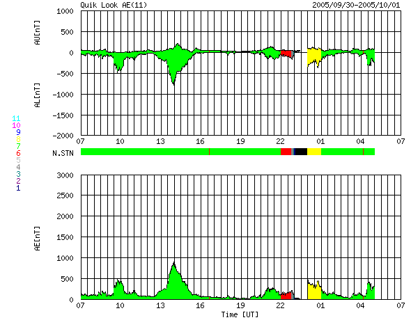 ACEが観測した太陽風の磁場(1番上の枠、白線は全体の強度、赤線は南北成分) および、太陽風の密度(3番目の橙線)、速度(4番目の黄線) (c) NOAA/SEC ![]() リアルタイムAE指数 下段のAEグラフの値が高くなると、オーロラ活動が活発化しています。 (c) 京都大学, NICT ![]() GOES衛星の太陽X線データ (c) NOAA/SEC ![]() SOHO衛星のMDIカメラによる太陽黒点 (c) SOHO (ESA & NASA) ![]() | ||||||||||||||||||||||||||||||||||||||||