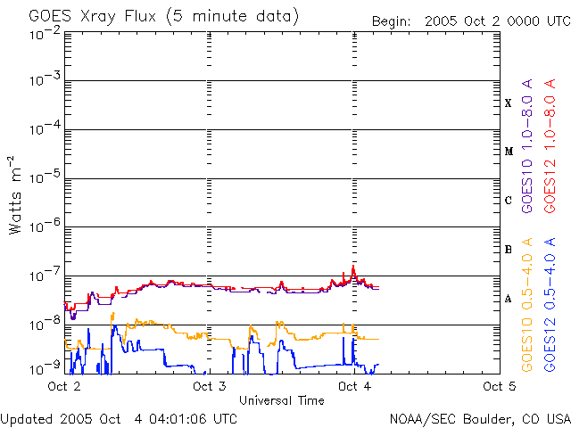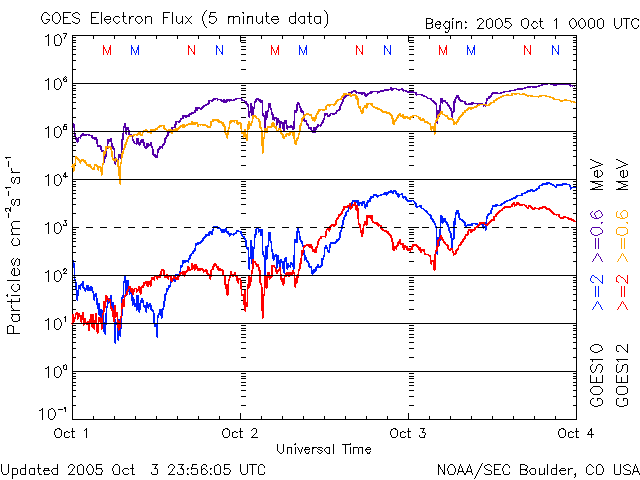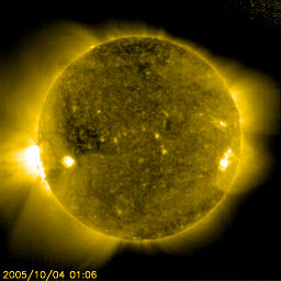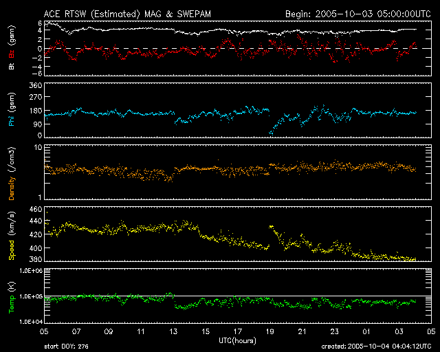 2005/10/ 4 13:06 更新 太陽風速度は下がっています(380km/秒)。放射線帯の高エネルギー電子が増加しています。 担当 篠原 太陽風の速度は一段と低下して、380km/秒に下がっています。 磁場強度は4nT。小さな振幅で南北に振動が見られています。 AEデータに障害が発生しているようで、プロットが止まっています。 しかし、太陽風の速度が下がっていますので、大きなオーロラ活動は起こしていないでしょう。 太陽風はこのまま穏やかな状態が続き、磁気圏も静穏を保つと思われます。 SOHO EIT284の太陽写真を見ると、太陽の左半分のところにコロナホールが見えています。 周囲もやや暗くなっているため、見にくくなっています。 次の太陽風の乱れは、このコロナホールによるものとなるでしょう。 5〜6日後くらいに、地球に影響を及ぼす位置に来そうです。 また、この写真では、太陽の東端(左端)がかなり明るくなっています。 間もなく、新しい黒点群が上がって来ると思われます。 現在の太陽面には黒点は見られません。 X線のグラフも低いままで、フレア活動は穏やかです。 放射線帯の高エネルギー電子が更に増加して、警戒ラインである10の4乗の線に近づいています。 明日、更に増加すると警戒ラインを越える事になります。 衛星の運用では支障が発生しやすくなりますので、注意が必要です。 SOHO衛星のEIT284カメラの映像 (c) SOHO (ESA & NASA)