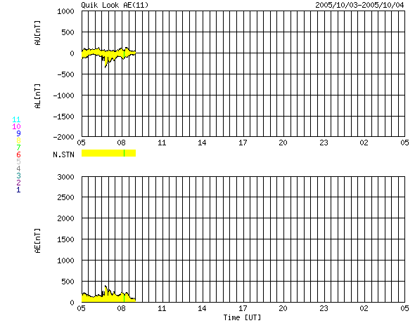 ACEが観測した太陽風の磁場(1番上の枠、白線は全体の強度、赤線は南北成分) および、太陽風の密度(3番目の橙線)、速度(4番目の黄線) (c) NOAA/SEC ![]() リアルタイムAE指数 下段のAEグラフの値が高くなると、オーロラ活動が活発化しています。 (c) 京都大学, NICT ![]() SOHO衛星のMDIカメラによる太陽黒点 (c) SOHO (ESA & NASA) ![]() GOES衛星の太陽X線データ (c) NOAA/SEC ![]() GOES衛星による、静止衛星軌道における高エネルギー電子の変化 (c) NOAA/SEC ![]() | ||||||||||||||||||||||||||||||||||||||||