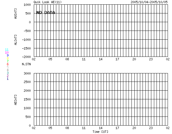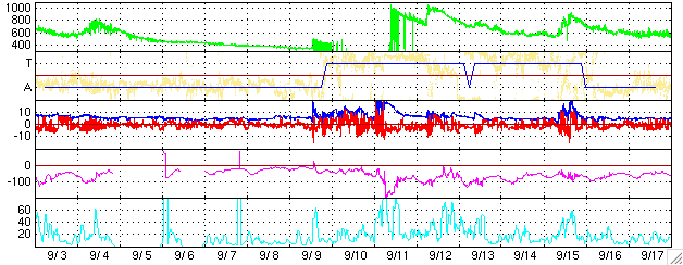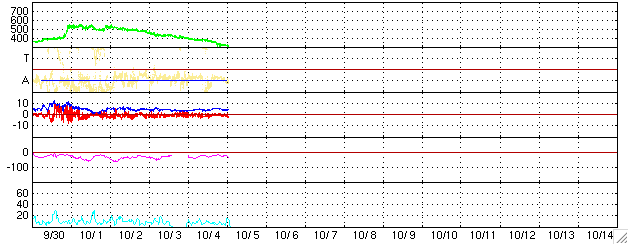 SOHO衛星のMDIカメラによる太陽黒点 (c) SOHO (ESA & NASA) ![]() GOES衛星の太陽X線データ (c) NOAA/SEC ![]() ACEが観測した太陽風の磁場(1番上の枠、白線は全体の強度、赤線は南北成分) および、太陽風の密度(3番目の橙線)、速度(4番目の黄線) (c) NOAA/SEC ![]() リアルタイムAE指数 下段のAEグラフの値が高くなると、オーロラ活動が活発化しています。 (c) 京都大学, NICT ![]() 27日の太陽周期に合わせたデータプロット (太陽風版) 太陽が同じ面を地球に向けていた27日前の変化から、今後を予想することができます。 (c) NICT