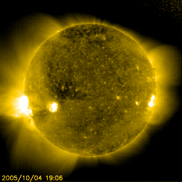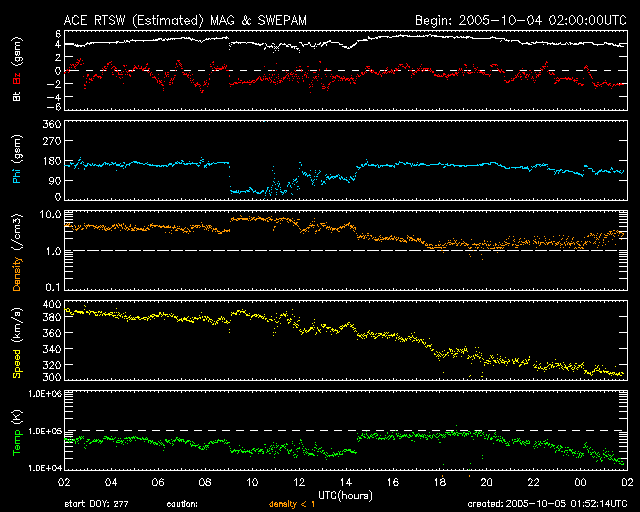 2005/10/ 5 10:56 更新 太陽風、磁気圏は静穏です。新しく813黒点群が出現しています。 担当 篠原 太陽面に新しい黒点群が出現しました。 中心からやや南東(左下)に数個の黒点が見えています。 813黒点群と番号が付けられたようです。 今のところ、フレア活動は見られていません。 今後どのような活動を見せるのでしょうか。 SOHO EIT284の写真では太陽の東の端(左端)がかなり明るくなり、X線のグラフも押し上げられています。 ここに上がって来る黒点群は、9月の上旬に激しいフレア活動を起こした808黒点群が周回してきたものです。 もはや、あの頃の勢いはありませんが、どのような姿を見せるでしょうか。 太陽風は更に速度を下げ続け、300km/秒にまで下がっています。 磁場強度は4nTとほとんど変化ありません。 -1〜-2nTの小さな南向きがちょこちょこ現れていますが、その振幅は小さなものです。 AE指数のグラフが停止していますので正確なところは分かりませんが、 太陽風の速度も遅いことから考えて、磁気圏はかなり静穏でしょう。 27日周期の図を見ると、前周期はちょうど808黒点群が大活躍をした時期で、太陽風が大きく乱れていました。 このため、今周期のデータとしてはあまり参考になりません。 ただ、その中で9月9日にセクターの切り替わりが発生しています。 これは太陽磁場の大きな構造と関係していますので、 この変化は今回も見られると思います(構造が大きく変わる事もありますが)。 明日、明後日の、6日から7日頃に発生するでしょう。 また、更に以前のデータを見ると、どうもこのセクター境界のところで、 急に太陽風磁場が強まる変化が発生する傾向があるようです。 今回はどの様になるでしょうか、明日以降の太陽風の変化に注目してください。 放射線帯の高エネルギー電子の密度増加は止まったようです。 GOES衛星のデータを見ると、ピークの値がやや下がっています。 警戒ラインに達する事はありませんでした。 SOHO衛星のEIT284カメラの映像 (c) SOHO (ESA & NASA)