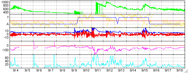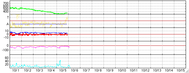 ACEが観測した太陽風の磁場(1番上の枠、白線は全体の強度、赤線は南北成分) および、太陽風の密度(3番目の橙線)、速度(4番目の黄線) (c) NOAA/SEC ![]() リアルタイムAE指数 下段のAEグラフの値が高くなると、オーロラ活動が活発化しています。 (c) 京都大学, NICT ![]() 27日の太陽周期に合わせたデータプロット (太陽風版) 太陽が同じ面を地球に向けていた27日前の変化から、今後を予想することができます。 (c) NICT