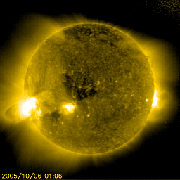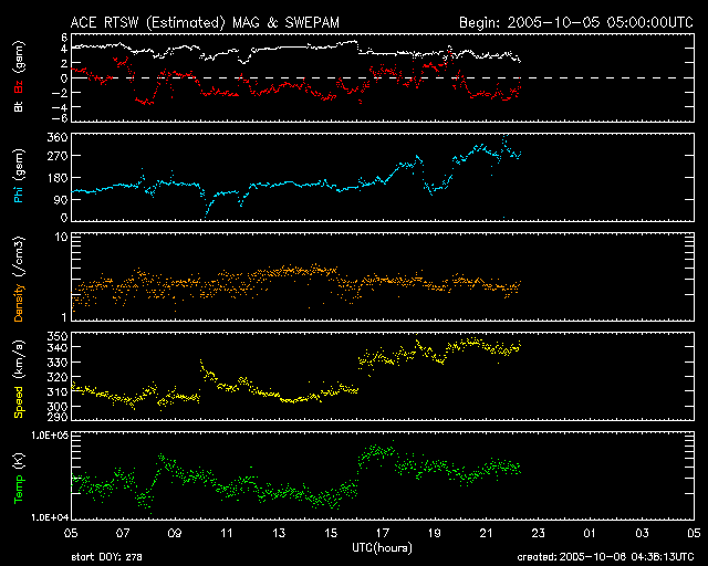 2005/10/ 6 13:43 更新 太陽風は低速状態が続いています(350km/秒)。コロナホールが太陽の中心に見えています。 担当 篠原 ACE衛星の太陽風データを受信するシステムに障害が発生しているようです。 アンテナなどの受信部の問題ではないかと思うのですが、 今朝の6日7時半(世界時5日22時半)からデータが止まっています。 そこまでの様子では、太陽風の速度は、昨日よりやや上がりましたが350km/秒と低速です。 太陽風の磁場は、-2〜-3nT程度の弱い南向きが続いています。 現在もAE指数のデータが出ていないため、オーロラの活動度が分かりませんが、 極域では、小規模なオーロラが度々発生しているのではないでしょうか。 また、セクター境界を迎えているようです。 この後に、太陽風の様子に変化が見られるかもしれません。 SOHO EIT284の太陽写真を見ると、太陽の中心付近に黒いコロナホールが見えています。 これから3日後くらいに、ここから出ている高速の太陽風が地球にあたると思われます。 また、東端(左端)を見ると、とても明るい領域があります。 ここは、前周期に808黒点群として激しい活動を起こした領域です。 いよいよ太陽のこちら側に回り込んできました。 しかし、黒点写真を見ると、この場所には黒点はなく、白い筋がちらちら見えているだけです。 すっかり弱まってしまったのでしょう。 813黒点群はC1の小さな小規模フレアを起こしたそうです。 黒点群の規模は、昨日からあまり変わらないようです。 今のところ、小規模の活動が見られる程度でしょう。 SOHO衛星のEIT284カメラの映像 (c) SOHO (ESA & NASA)