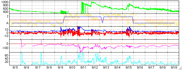 ACEが観測した太陽風の磁場(1番上の枠、白線は全体の強度、赤線は南北成分) および、太陽風の密度(3番目の橙線)、速度(4番目の黄線) (c) NOAA/SEC ![]() リアルタイムAE指数 下段のAEグラフの値が高くなると、オーロラ活動が活発化しています。 (c) 京都大学, NICT ![]() SOHO衛星のMDIカメラによる太陽黒点 (c) SOHO (ESA & NASA) ![]() GOES衛星の太陽X線データ (c) NOAA/SEC ![]() 27日の太陽周期に合わせたデータプロット (太陽風版) 太陽が同じ面を地球に向けていた27日前の変化から、今後を予想することができます。 (c) NICT