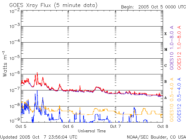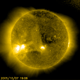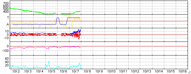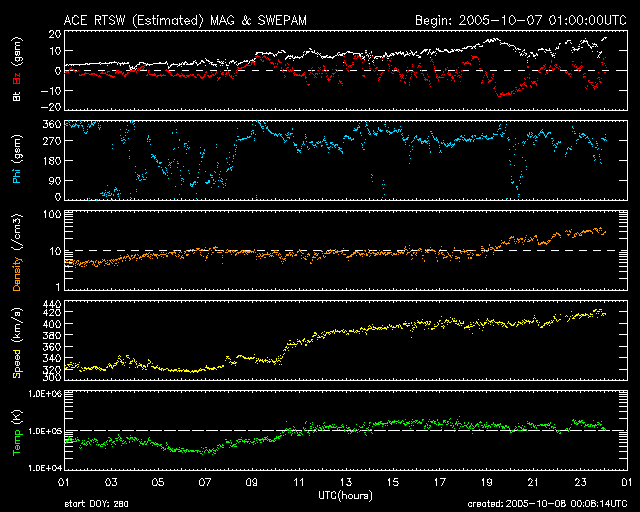 2005/10/ 8 09:13 更新 太陽風にコロナホールの影響が見られています(420km/秒)。今後更に速度が上昇していくでしょう。 担当 篠原 コロナホールの影響が始まった様です。 7日19時(世界時7日10時)から太陽風の速度が上昇を始めています。 それまで330km/秒とかなり遅かった太陽風が、 緩やかに上昇を続けて、現在420km/秒にまで上がっています。 ただし、これは普通の太陽風の速度で、高速風と呼ぶほどには上がっていません。 また、太陽風の磁場強度も強まっています。 太陽風速度の上昇とともにこちらも強まっていて、現在は10nT前後で推移しています。 コロナホールの太陽風変化では、速度が上昇するところで磁場が強まる傾向があります。 従って、速度は引き続き上昇を続けると思われます。 SOHO EIT284の太陽写真を見ると、高速風の発生原因であるコロナホールが、 太陽の西側(右側)にせり出してきました。 目安として、コロナホールが太陽の中心と、西の端(右端)との中間点に来ると、 地球に風が届くようになります。 とすると、今回のコロナホールの中心が地球に影響を及ぼす位置に来るのはこれからです。 AE指数のグラフは停止したままです。 その他のデータを参考にすると、オーロラ活動がやや活動的になってきている様です。 ACEの太陽風データを見ると、-10nTもの南向き磁場が発生したりしており、 今後速度が上昇すると一段と活動は活発化するでしょう。 太陽では813黒点群は規模を縮小しているようです。 フレア活動は全く見られず、とても穏やかな太陽活動になっています。 この状態は今後も続きそうです。 SOHO衛星のEIT284カメラの映像 (c) SOHO (ESA & NASA)