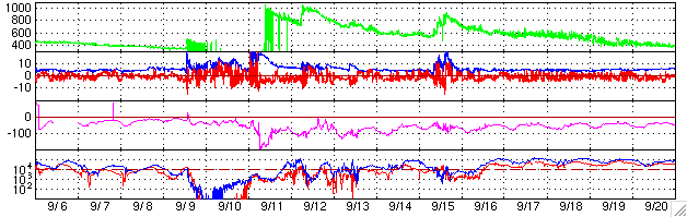 沖縄の磁場擾乱 下へ下がるほど、擾乱が発達している事を意味します。 (c) NICT ![]() SOHO衛星のMDIカメラによる太陽黒点 (c) SOHO (ESA & NASA) ![]() 27日の太陽周期に合わせたデータプロット (放射線帯電子版) 太陽が同じ面を地球に向けていた27日前の変化から、今後を予想することができます。 (c) NICT