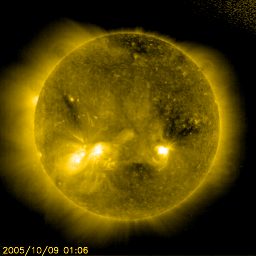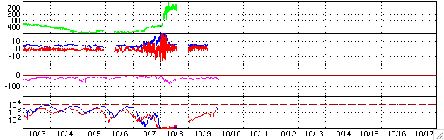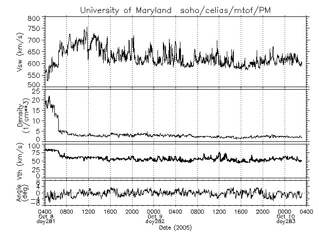 2005/10/10 12:56 更新 太陽風の速度は600km/秒で高速です。磁気圏は比較的静穏の様です。 担当 篠原 昨日より、NOAA/SEC関係のデータの更新が止まっています。 日頃お世話になっている多くの図を見る事ができません。 今日は、断片的な資料から宇宙天気を分析することになります。 今日の初めの図はSOHO衛星による太陽風観測データです。 昨日お伝えした様に、太陽風の速度は700km/秒に上がりました。 図を見ると、その後はゆっくりと低下傾向にあるようです。 現在は600〜650km/秒の範囲で変化しています。 SOHO EIT284の写真は、撮影時刻が1日ほど前になっています。 コロナホールはちょうど太陽の中心と西端(右端)の真ん中にあって、 地球へもっとも影響を及ぼす位置に来ています(これは、見かけ上の位置です)。 現在は、コロナホールはこれよりも更に西へ進んでいますので、影響を及ぼす位置から抜けつつあります。 これから太陽風の速度は一層低下して、次第に通常の状態に戻って行くと思われます。 太陽風の磁場強度は5nT程度の普通の状態が続いているようです。 あまり強く南を向く事もなく、磁気圏は比較的穏やかになっていると思われます。 (27日周期の図に断片的にデータが出ています) AE指数のグラフがないために正確なところは分かりませんが、 沖縄の磁場データを見ると、目立った変化は現れておらず、磁気圏は概ね静穏だと思われます。 一方、放射線帯の高エネルギー電子が増加しつつあるようです。 明日くらいには警戒レベルに達するかもしれません(27日周期の図に断片的にデータが出ています)。 やがて図の更新が再開されると思いますので、注意して下さい。 太陽面は813黒点群がほとんど見えなくなっています。 他に黒点群は無く、フレア活動は穏やかでしょう。 SOHO衛星による太陽風の観測データ。1列目は速度、2列目は密度。 (c) University of Maryland ![]() SOHO衛星のEIT284カメラの映像 (c) SOHO (ESA & NASA)