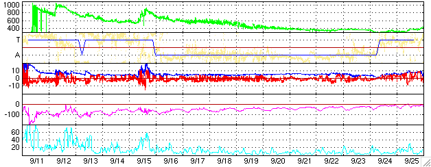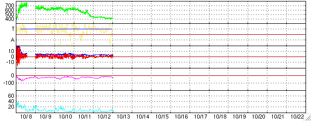 ACEが観測した太陽風の磁場(1番上の枠、白線は全体の強度、赤線は南北成分) および、太陽風の密度(3番目の橙線)、速度(4番目の黄線) (c) NOAA/SEC ![]() 沖縄の磁場擾乱 下へ下がるほど、擾乱が発達している事を意味します。 (c) NICT ![]() GOES衛星の太陽X線データ (c) NOAA/SEC ![]() SOHO衛星のMDIカメラによる太陽黒点 (c) SOHO (ESA & NASA) ![]() 27日の太陽周期に合わせたデータプロット (太陽風版) 太陽が同じ面を地球に向けていた27日前の変化から、今後を予想することができます。 (c) NICT