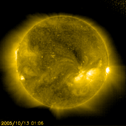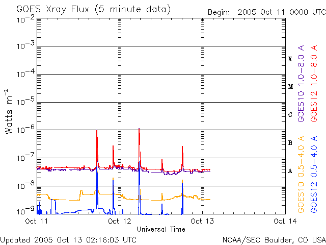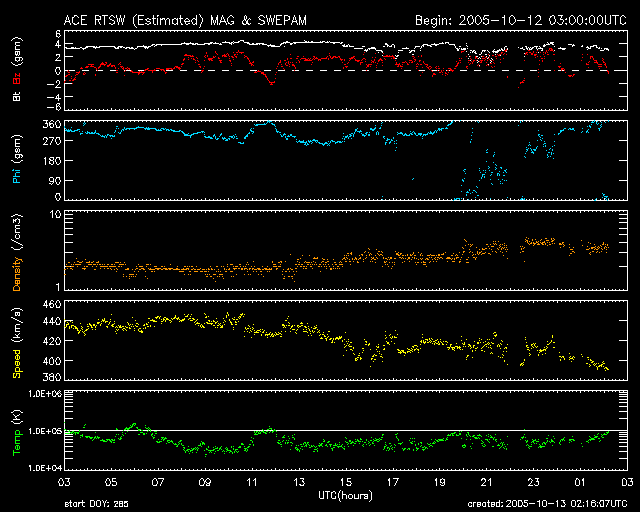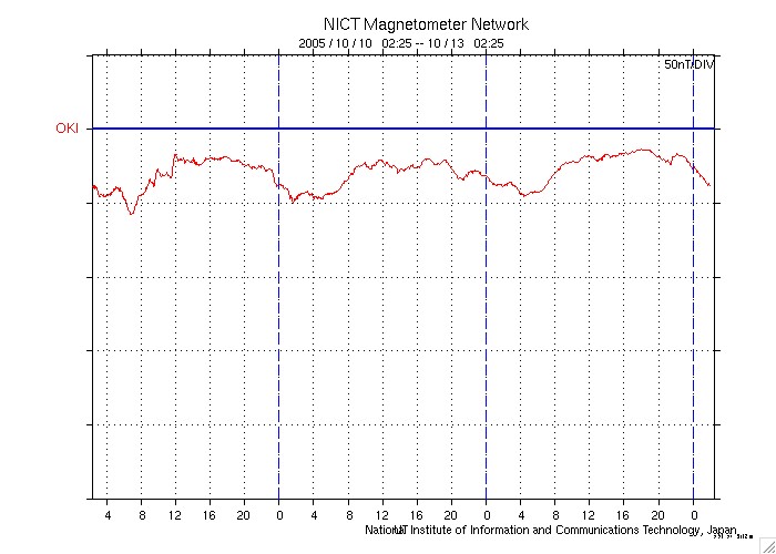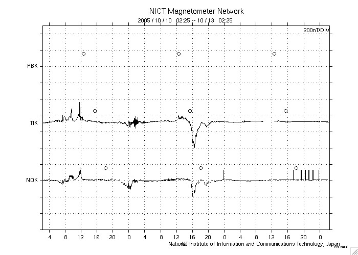 2005/10/13 11:23 更新 太陽風は400km/秒で、通常の速度に下がっています。磁気圏はとても穏やかです。 担当 篠原 太陽風は順調に速度を下げています。 昨日の440km/秒から、現在は400km/秒まで下がっています。 磁場強度は4nT前後と変わりありませんが、 南北成分が北寄りの傾向を強めています(ACEのグラフの赤線が、プラス側に偏っています)。 このため、オーロラなどの磁気圏活動はとても穏やかになっています。 シベリアのオーロラ帯で観測した磁場データを1枚目の図として掲載しています。 3日分のデータを示しており、右側の3分の1が昨日のデータです。 ほぼ一直線になっていて、全く変化が見えていません。 一方、左端3分の1と、真ん中3分の1には、プラス、マイナスの方向の違いはありますが、 小規模の変化が見えています。 これは、これらの観測点上空でオーロラなど磁気圏活動に関係する電流が流れていた事を示しています。 一昨日、3日前には、小さいながらも磁気圏では活動が見られていました。 それらと比べると、昨日はとても穏やかだったようです。 穏やかな太陽風はまだしばらく続きそうです。 SOHO EIT284では、太陽の中心付近に細いコロナホールが見えており、 明日、明後日頃から地球へ影響が及ぶ(太陽風の速度が上がる)可能性があります。 ただし、コロナホールの規模は小さいので、乱れも小規模に終わるのではないでしょうか。 その後は、再び穏やかな状態が続くでしょう。 太陽のフレア活動も概ね静穏です。 細い、小さな変化がGOES衛星のX線グラフで見えていますが、どれもとても小規模なものです。 活動を起こしている領域は804番と呼ばれているようですが、 ここに掲載している太陽写真では、黒点の姿を見る事はできません。 太陽活動も、このまま穏やかに推移するでしょう。 シベリアのオーロラ帯の磁場観測。3日分のデータを示しています。右端の3分の1が昨日のデータです。 (c) NICT ![]() SOHO衛星のEIT284カメラの映像 (c) SOHO (ESA & NASA)