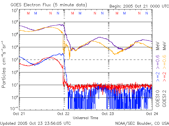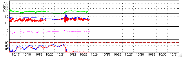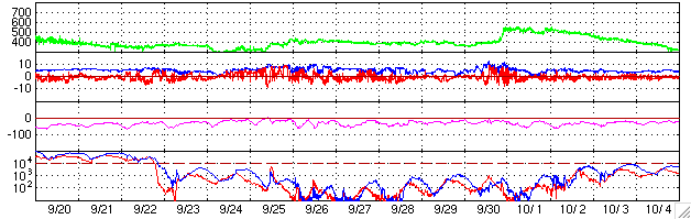 ACEが観測した太陽風の磁場(1番上の枠、白線は全体の強度、赤線は南北成分) および、太陽風の密度(3番目の橙線)、速度(4番目の黄線) (c) NOAA/SEC ![]() 沖縄の磁場擾乱 下へ下がるほど、擾乱が発達している事を意味します。 (c) NICT ![]() GOES衛星による、静止衛星軌道における高エネルギー電子の変化 (c) NOAA/SEC ![]() 27日の太陽周期に合わせたデータプロット (放射線帯電子版) 太陽が同じ面を地球に向けていた27日前の変化から、今後を予想することができます。 (c) NICT