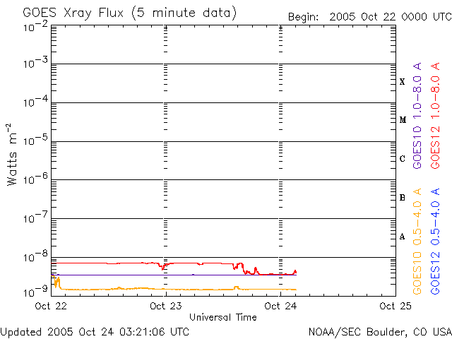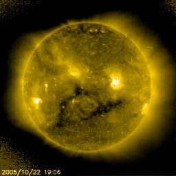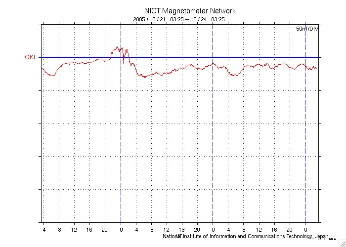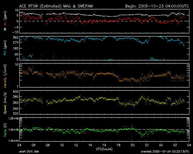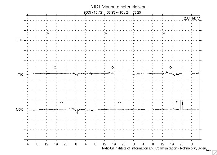 2005/10/24 12:22 更新 太陽風は穏やかで、磁気圏も静かです。これからコロナホールの影響が見られるでしょう。 担当 篠原 太陽風は穏やかな状態が続いています。 速度は360km/秒前後と遅い状態で安定しています。 磁場強度は5nT前後とほぼ普通の強さで、こちらもほぼ安定しています。 オーロラ活動につながる、磁場の南向き成分はあまり見られません。 ACEの図の赤線は、0からややプラス(北向き)寄りになっています。 このため、オーロラ活動も穏やかな状態が続いています。 シベリアのデータは今日もほぼ平らで、3日間のプロット全部がほぼ平坦な状態になっています。 SOHO EIT284の太陽写真を見ると、コロナホールの右端が、太陽の中心と西の端との中間点に達しています。 ここはコロナホールの影響で太陽風が乱れ始めるタイミングを見るための目安の位置です。 従って、そろそろ太陽風の速度が上がるなど乱れが起こってもおかしくありません。 これから明日にかけて、何らかの変化が見られるのではないでしょうか。 それほど大きな乱れにはならないと思いますが、変化の様子に注目です。 一昨日から、GOES衛星による静止軌道の高エネルギー電子の図が興味深い変化を示しています。 図を見ると、いつも注目している赤線と青線(2MeV以上のエネルギーを持つ電子)がストンと下に下がって、 最低レベルで推移しています。 値が落ちたのは、22日のニュースでお知らせした太陽風の乱れが原因になっています。 これほどグラフが落ちてしまうのは珍しいことです。 直接は関係ありませんが、GOES衛星のX線のグラフもまたものすごく下がっています。 ここ何日もとても低い状態が続いていましたが、 今日のグラフはもうこれ以上下がらないのではないかと思われるような状態になっています。 X線で見ていると、太陽はもはや輝いていないかのようです(可視光では何の変化も見えませんが)。 太陽写真には黒点は見えていません。 815黒点群はなくなったそうです。 一方、817黒点群ができたそうですが、1個小さいのがある程度の様です。 シベリアのオーロラ帯の磁場データ。3日分のデータを示しています。右端の3分の1が昨日のデータです。 (c) NICT ![]() SOHO衛星のEIT284カメラの映像 (c) SOHO (ESA & NASA)