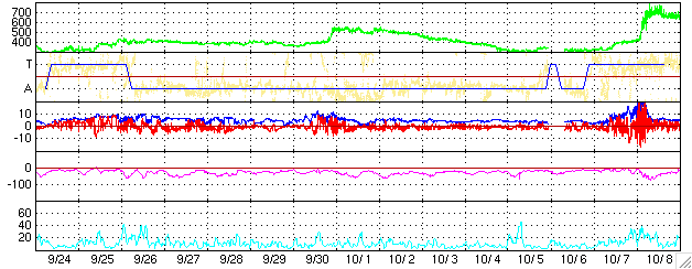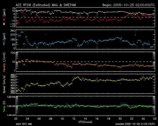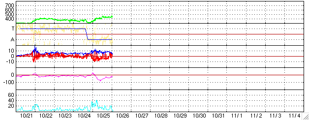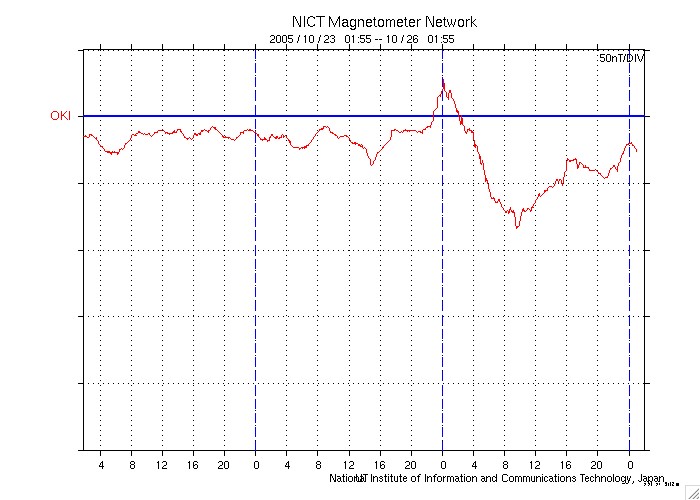 ACEが観測した太陽風の磁場(1番上の枠、白線は全体の強度、赤線は南北成分) および、太陽風の密度(3番目の橙線)、速度(4番目の黄線) (c) NOAA/SEC ![]() 沖縄の磁場擾乱 下へ下がるほど、擾乱が発達している事を意味します。 (c) NICT ![]() 27日の太陽周期に合わせたデータプロット (太陽風版) 太陽が同じ面を地球に向けていた27日前の変化から、今後を予想することができます。 (c) NICT