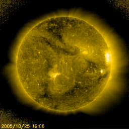 2005/10/26 10:53 更新 太陽風の速度がやや上がり(450k/秒)、オーロラ活動が発生しています。 担当 篠原 太陽風の速度が上がって、450km/秒とやや高速になっています。 先日より太陽面に見えていたコロナホールの影響が及び始めたようです。 ACEの観測によると、速度は半日ほどかけてゆっくりと上昇しました。 25日21時(世界時25日12時)頃からは450km/秒でほぼ安定しています。 太陽風の磁場強度も10nTに強まり、 しかも-5nT程度で比較的安定して南向き(赤線がマイナス)を続けています。 このため、磁気圏の活動が活発になっています。 シベリアの磁場変化を見ると、プラス、マイナスと両方に大きく変化しています。 最大と最小の差は800〜1000nTくらいになり、 AE指数で考えると、活発なオーロラ活動が続いている様子です。 残念ながらアラスカは曇っていて、ライブカメラの映像を見ると、 雲の上でオーロラが輝いて周囲が明るくなったりしています。 雲の上ではきれいなオーロラが見えていたのでしょう。 コロナホールは東西に広く延びていましたので、太陽風の乱れはもう数日続くと思われます。 速度がこれ以上大きく上がる事はないと思います。 ACEのデータでは、太陽風の磁場が北寄りの傾向になっているようで、 今後のオーロラ活動がどうなるか注目されます。 ACEデータの赤線がプラス寄りに変化する様になると、オーロラ活動は弱まります。 GOES衛星の観測では、放射線帯の高エネルギー電子密度が上がって、 グラフに変化が見える様になっています。 このところ極端に下がってしまっていましたが、普段の状態に戻った様です。 太陽は現在もとても穏やかです。 X線のグラフは相変わらず最低レベルをたどっています。 黒点はなくなっている様です(写真には817の番号がありますが)。 静かな日がずいぶんと続いています。 シベリアのオーロラ帯の磁場データ。3日分のデータを示しています。右端の3分の1が昨日のデータです。 (c) NICT ![]() SOHO衛星のEIT284カメラの映像 (c) SOHO (ESA & NASA)