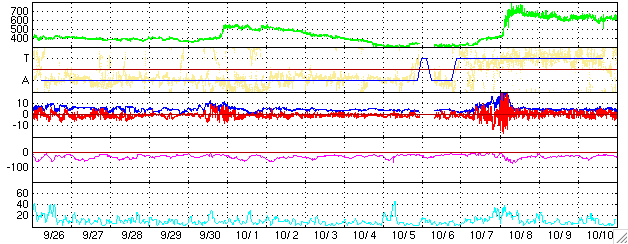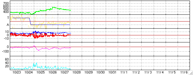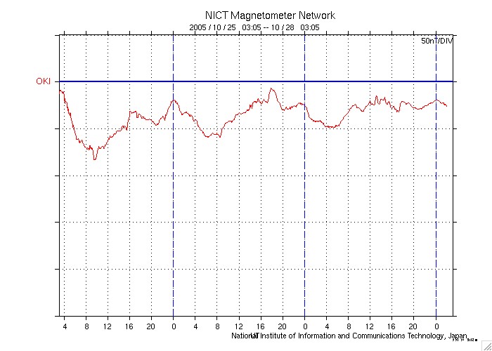 ACEが観測した太陽風の磁場(1番上の枠、白線は全体の強度、赤線は南北成分) および、太陽風の密度(3番目の橙線)、速度(4番目の黄線) (c) NOAA/SEC ![]() 沖縄の磁場擾乱 下へ下がるほど、擾乱が発達している事を意味します。 (c) NICT ![]() 27日の太陽周期に合わせたデータプロット (太陽風版) 太陽が同じ面を地球に向けていた27日前の変化から、今後を予想することができます。 (c) NICT