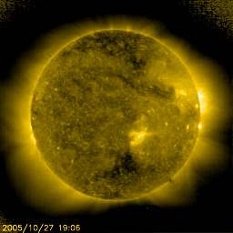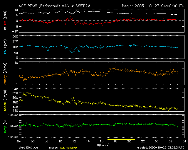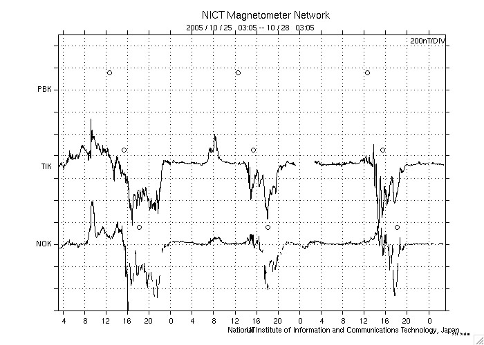 2005/10/28 12:10 更新 太陽風はやや高速です(450km/秒)。南向き太陽風磁場に合わせて、オーロラの活動が見られています。 担当 篠原 太陽風の速度は緩やかに低下しています。 昨日の500km/秒から450km/秒へ、ほぼ一日かけて下がっています。 やや高速という状態です。 太陽風の速度は、この後もゆっくりと下がって行きそうです。 太陽風磁場は6nTから8nTくらいの間をゆっくりと変化しています。 ACEの図のまんなか付近で、-3nT程度の南向き(赤線がマイナスになっている)が続く変化が見えています。 ここでオーロラが活発になった様です。 シベリアの磁場データを見ると、昨日のデータに(右側の3分の1がその部分です)、 600〜800nTくらいの変動が観測されています。 シベリアのデータだけでは24時間のオーロラ活動の様子を知る事はできませんので、 その他の時間帯がどうなっていたか、この図だけではコメントできませんが、 少なくとも、太陽風磁場の南向きに合わせて、オーロラがにぎやかに活動していたのは確かです。 SOHO EIT284の太陽カメラの写真では、 北と南(上と下)に寄った地域にコロナホールらしき暗い部分が見えています。 この様な高緯度領域のコロナホールは、地球へは影響を及ぼしません。 一方、赤道付近はのっぺりとして、コロナホールは見られません。 これから太陽風の速度が下がると、その後は10日くらい穏やかな太陽風が続きそうです。 放射線帯の高エネルギー電子は、やや増加していますが、大きな変化にはなっていません。 もうしばらく様子を見る必要がありますが、今のところは警戒ラインに達する勢いは見られません。 太陽面はとても静かです。黒点は見えていません。 X線のグラフもとても静かで、穏やかな太陽が続いています。 シベリアのオーロラ帯の磁場データ。3日分のデータを示しています。右端の3分の1が昨日のデータです。 (c) NICT ![]() SOHO衛星のEIT284カメラの映像 (c) SOHO (ESA & NASA)