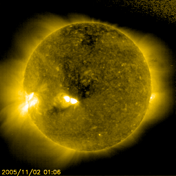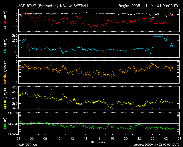 2005/11/ 2 12:06 更新 太陽風速度は減少し、宇宙天気は穏やかな状態です。 担当 北村 昨日のお知らせした太陽風磁場の強まりが通過した後は、 太陽風は比較的静穏な状態に戻っています。 速度は、徐々に下がっていって 1日の22時頃には350km/s程度まで遅くなっています。 沖縄磁場変動を見ると、31日にやや減少していた磁場が、 1日にかけて徐々にもとのレベルに戻っていく様子が分かります。 大きな特徴としては、1日の13時から20時にかけて、 太陽風磁場の南向き成分が、弱い南向き(-5nT程度) を継続している点が挙げられます。 シベリアの磁場データを見ますと、 1日の16時頃から磁場の強度が大きく減少しています。 これは、先述の太陽風磁場の南向き成分に起因したオーロラ嵐を表しており、 この時間磁気圏活動が活発であったと思われます。 太陽活動は静穏で、黒点の状態は領域818に若干黒点群が 見られますが、大きなX線フレアーは発生しておりません。 その一方で、SOHO EIT284の図で分かるように、 コロナホールが徐々に正面に向いてきています。 もう数日すると、このコロナホールの影響によって太陽風速度が上昇するでしょう。 SOHO衛星のEIT284カメラの映像 (c) SOHO (ESA & NASA)