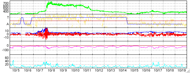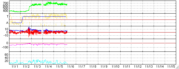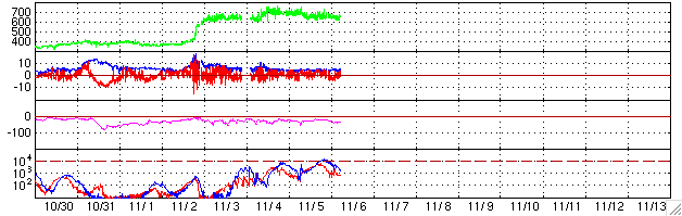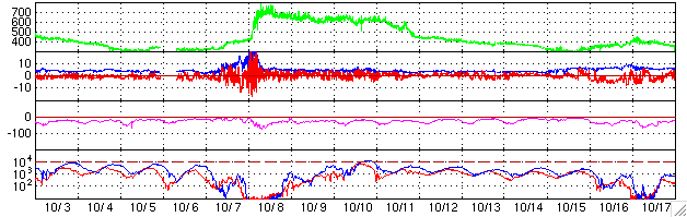 ACEが観測した太陽風の磁場(1番上の枠、白線は全体の強度、赤線は南北成分) および、太陽風の密度(3番目の橙線)、速度(4番目の黄線) (c) NOAA/SEC ![]() GOES衛星の太陽X線データ (c) NOAA/SEC ![]() シベリアで観測された3日間の磁場データ 右側の3分の1が、昨日のデータになります。グラフが上がったり下がったりすると、オーロラ活動が活発化しています。 (c) NICT ![]() GOES衛星による、静止衛星軌道における高エネルギー電子の変化 (c) NOAA/SEC ![]() 27日の太陽周期に合わせたデータプロット (太陽風版) 太陽が同じ面を地球に向けていた27日前の変化から、今後を予想することができます。 (c) NICT