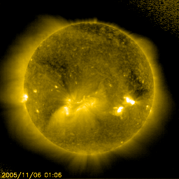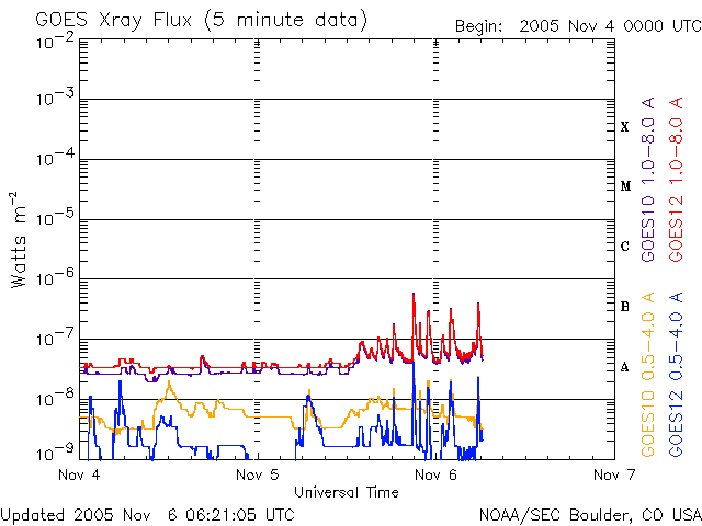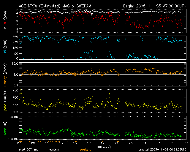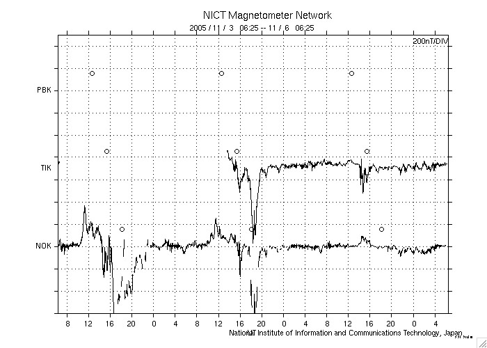 2005/11/ 6 15:24 更新 高速太陽風が続いています(650km/秒)。オーロラ活動はやや静穏になりました。 担当 北村 太陽風の速度は少し下がり約650km/s程度になりましたが、 以前高速状態が継続しています。3日以来、太陽風の高速状態は 4日目に突入しておりコロナホール起源の高速太陽風はかなり 長く継続しています。 SOHO EIT284の画像を見ますと、コロナホールの位置が徐々に 西の方(向かって右側)へ移動していっており、この後太陽風 速度は徐々に減少していく事が予想されます。 一方で、少し明るい領域が真ん中あたりに差し掛かっているのが 分かります。この影響で、GOESのX線のレベルが少し上昇しています。 尤も最大でもBクラス程度ですので大きな影響を及ぼすほどではありません。 ACEのグラフの上の赤線の変化を見てもらうと概ねゼロより上のレベルにあるのが分かります。 すなわち太陽風磁場の南向き成分は、概ね北向きの状態を継続していました。 そのため、太陽風の速度が高速であるにもかかわらず、地上磁場ではそれほど大きな 擾乱現象は発生していません。 シベリアの磁場データを見てもらうと、5日以降大きな変化が現れていないのが 見て取れます。 ただし、磁気圏の静止軌道上では高エネルギーの電子が非常に増えており、 注意が必要なレベルに達しています。人工衛星の運用等には注意が必要です。 今後、太陽風速度が下がるまで継続して注意が必要です。 SOHO衛星のEIT284カメラの映像 (c) SOHO (ESA & NASA)