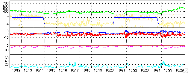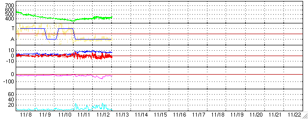 GOES衛星の太陽X線データ (c) NOAA/SEC ![]() SOHO衛星のMDIカメラによる太陽黒点 (c) SOHO (ESA & NASA) ![]() ACEが観測した太陽風の磁場(1番上の枠、白線は全体の強度、赤線は南北成分) および、太陽風の密度(3番目の橙線)、速度(4番目の黄線) (c) NOAA/SEC ![]() シベリアで観測された3日間の磁場データ 右側の3分の1が、昨日のデータになります。グラフが上がったり下がったりすると、オーロラ活動が活発化しています。 (c) NICT ![]() 27日の太陽周期に合わせたデータプロット (太陽風版) 太陽が同じ面を地球に向けていた27日前の変化から、今後を予想することができます。 (c) NICT