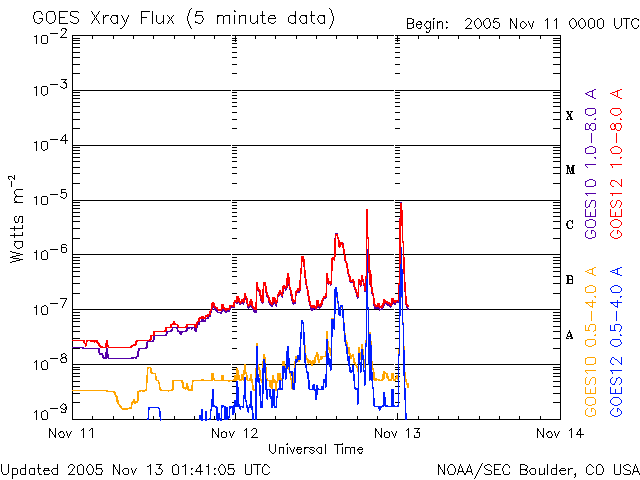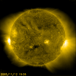 2005/11/13 10:46 更新 新しい黒点群で、M1の中規模フレアが2回発生しています。やや活発なオーロラ活動が見られています。 担当 篠原 太陽の東から上ってきた新しい活動領域が、活発な活動を示しています。 SOHO EIT294の太陽写真で左の端に明るく見えている部分です。 GOES衛星のX線観測によると、 13日4時(世界時12日19時)と、13日9時(世界時13日0時)の2回、 ほぼM1の小さな中規模フレアが発生しました。 活動領域そのものは、今日掲載している黒点写真には姿を見せていません。 しかし、NOAA/SECの情報では、 822黒点群という番号が付けられ、黒点群として確認されている様です。 引き続き小規模フレアを起こす可能性が高いとのことで、今後の活動が注目されます。 太陽風は、速度420km/秒、磁場強度6nTと、昨日とほぼ同じ状況です。 磁場強度がいくらか下がった程度でしょうか。 その一方で、南向きの太陽風磁場が比較的はっきりと現れています。 ACEのデータの赤線を見ると、-2〜-5nT程度の南向きが頻繁に、 しかも数時間続くように現れています。 このため、オーロラ活動もやや活発になっていると思われます。 シベリアの磁場データでは、最大で800nT程度の変化が見られています。 昨日、27日周期の図で予想していた太陽風の変化が現れている様です。 今後も南向き磁場の影響でオーロラ活動が続く可能性があります。 太陽風の速度が通常の程度なので、大きな活動には至らないでしょう。 カムチャッカは連日雨まじりの雪で、寒い様な、寒くない様な微妙な気候です。 普通の年だと、すっかり雪に覆われているとの事で、今年は特別の様です。 観測作業はほぼ終え、明日ウラジオストックへ発ちます。 更新メンバーの出張のために、月、火曜は更新できない可能性が高いです。 ご了承ください。 SOHO衛星のEIT284カメラの映像 (c) SOHO (ESA & NASA)
